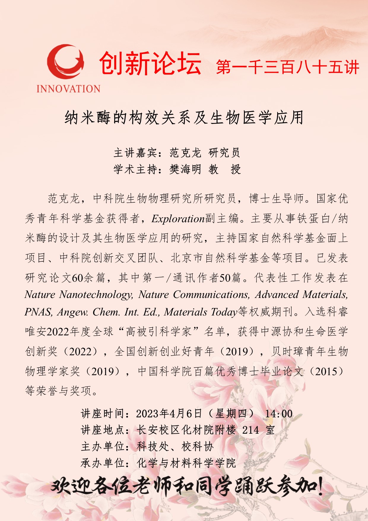 范克龙 研究员 8868体育登录创新论坛第一千三百八十五讲:纳米酶的构效关系及生物医学应用 讲座时间 2023年4月6日(星期四) 14:00 讲座地点 长安校区化材院附楼 214 室 讲座人介绍 范克龙 研究员 讲座内容