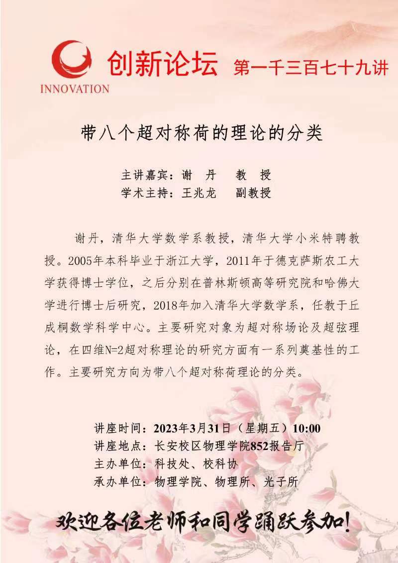 谢丹 教授 8868体育登录创新论坛第一千三百七十九讲:带八个超对称荷的理论的分类 讲座时间 2023年3月31日(星期五)10:00 讲座地点 长安校区物理学院852报告厅 讲座人介绍 谢丹 教授 讲座内容