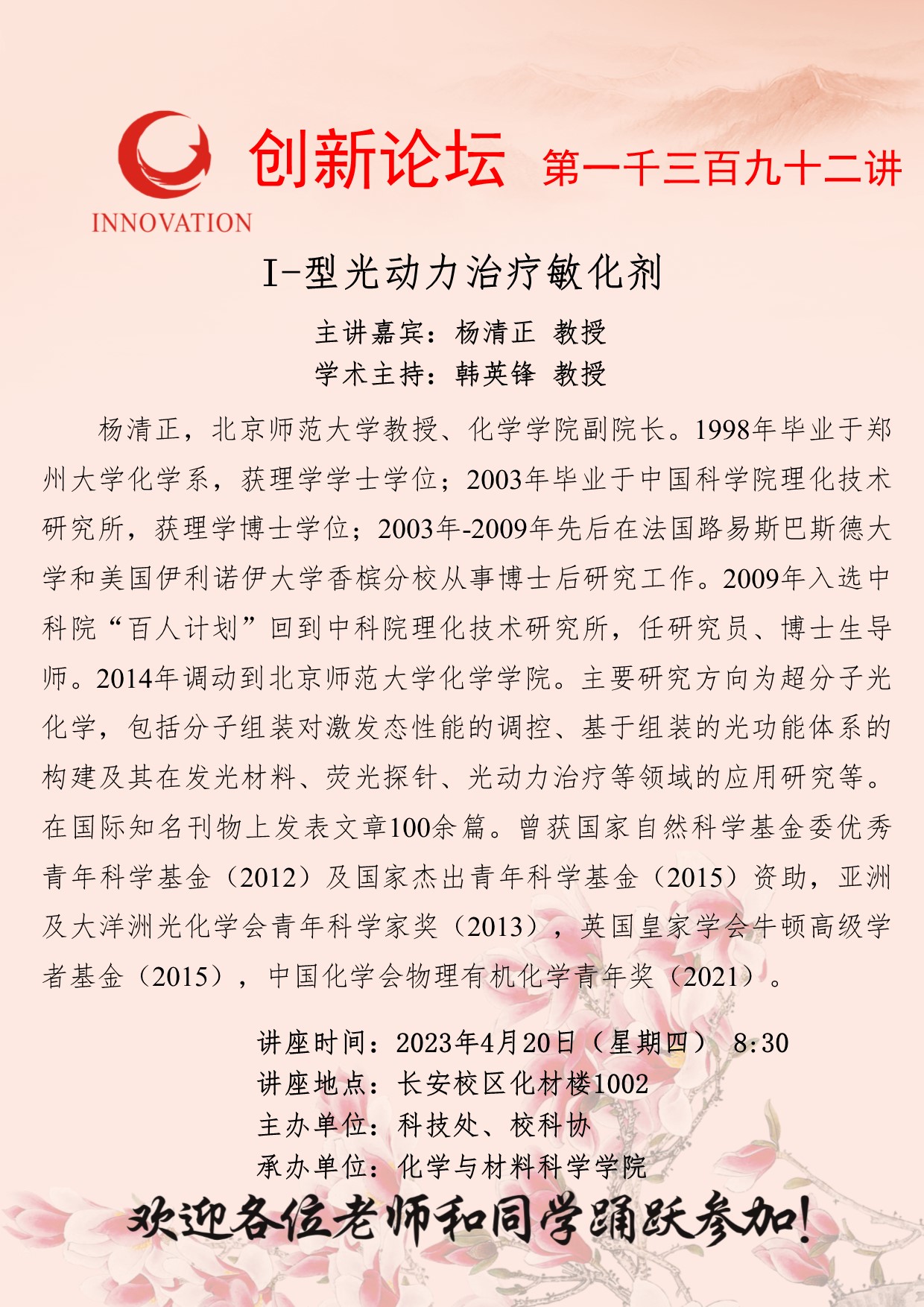 杨清正 教授 8868体育登录创新论坛第一千三百九十二讲:I-型光动力治疗敏化剂 讲座时间 2023年4月20日(星期四) 8:30 讲座地点 长安校区化材楼1002 讲座人介绍 杨清正 教授 讲座内容