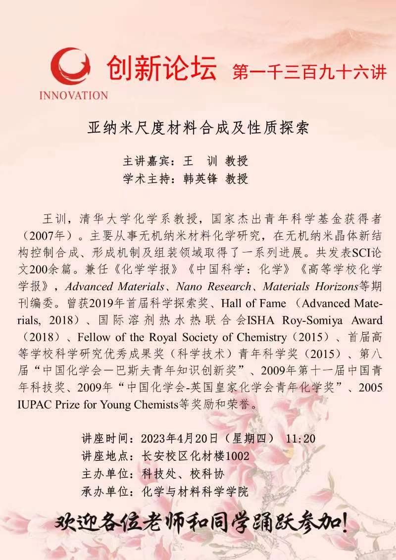 王 训 教授 8868体育登录创新论坛第一千三百九十六讲:亚纳米尺度材料合成及性质探索 讲座时间 2023年4月20日(星期四) 11:20 讲座地点 长安校区化材楼1002 讲座人介绍 王 训 教授 讲座内容