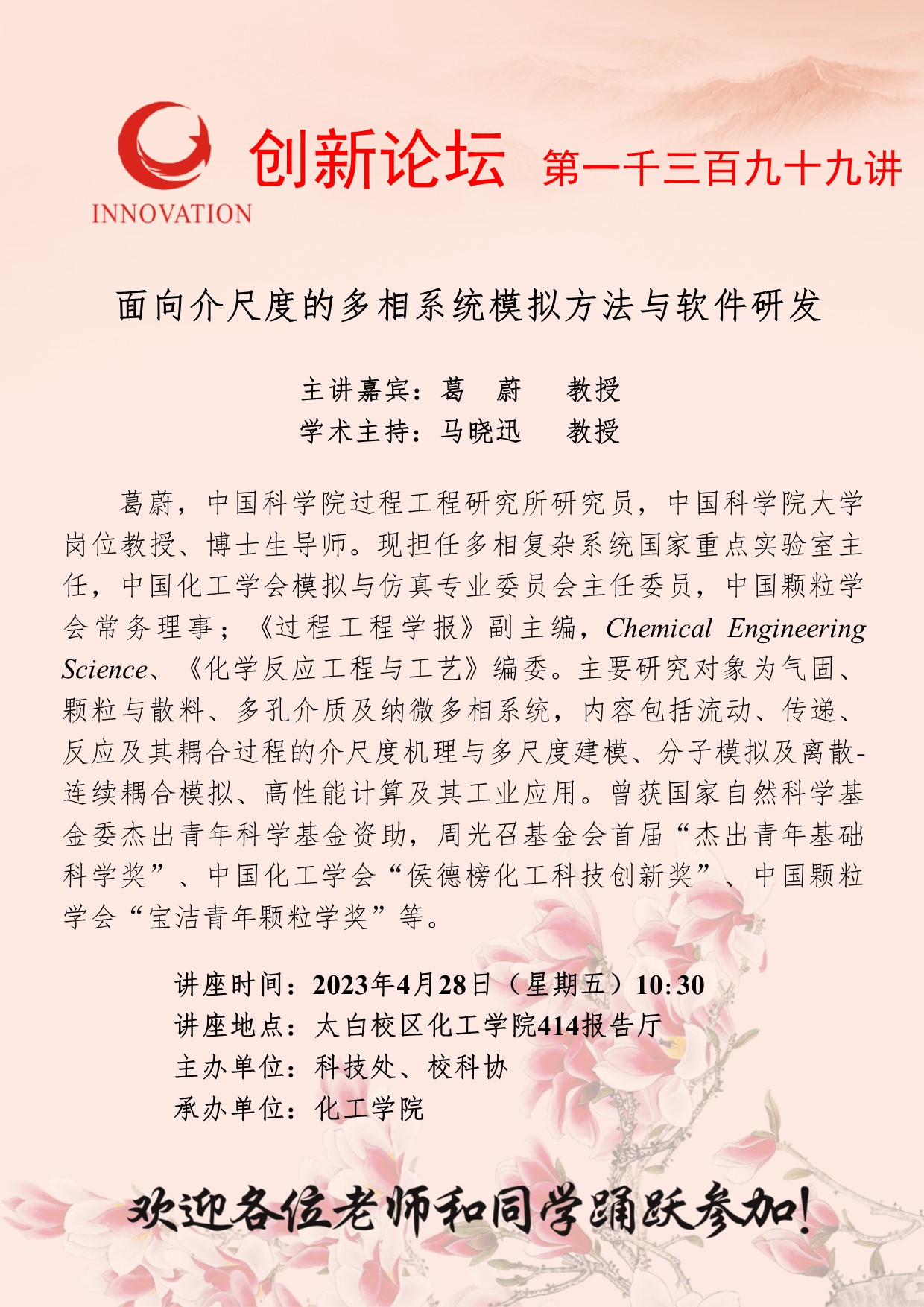 葛蔚 教授 8868体育登录创新论坛第一千三百九十九讲:面向介尺度的多相系统模拟方法与软件研发 讲座时间 2023年4月28日(星期五)10:30 讲座地点 太白校区化工学院414报告厅 讲座人介绍 葛蔚 教授 讲座内容