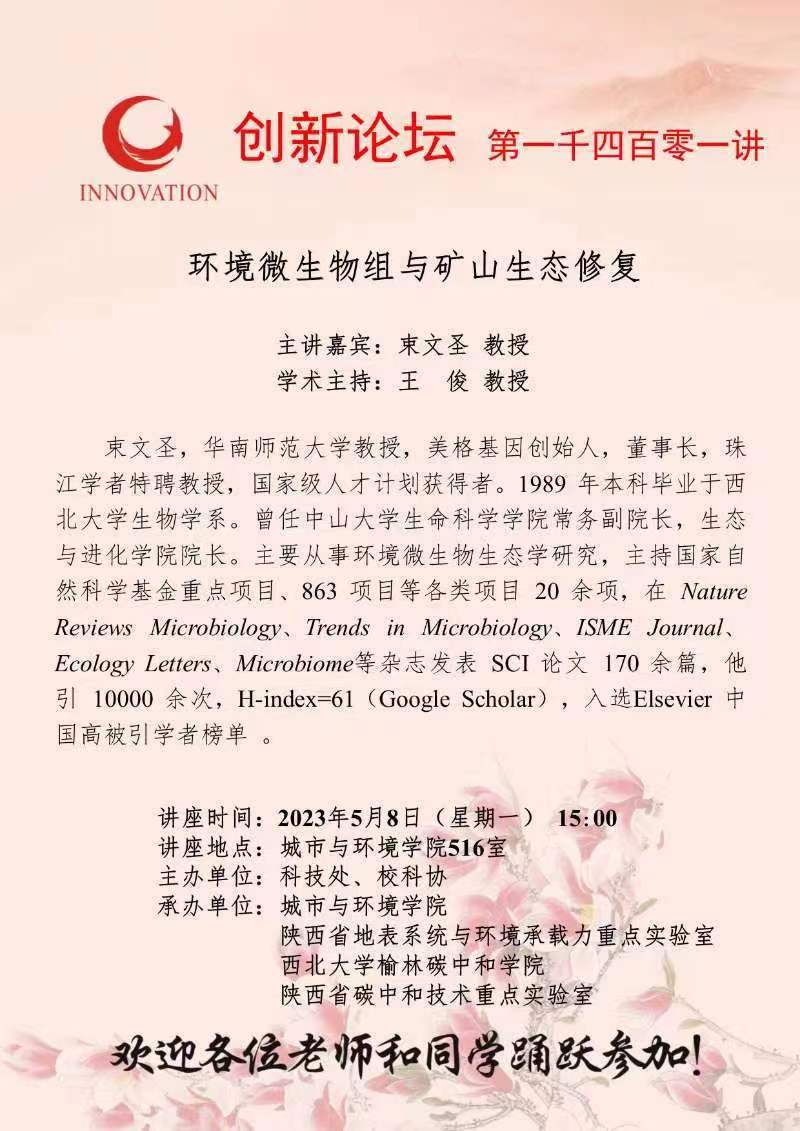 束文圣 教授 8868体育登录创新论坛第一千四百零一讲:环境微生物组与矿山生态修复 讲座时间 2023年5月8日(星期一) 15:00 讲座地点 城市与环境学院516室 讲座人介绍 束文圣 教授 讲座内容