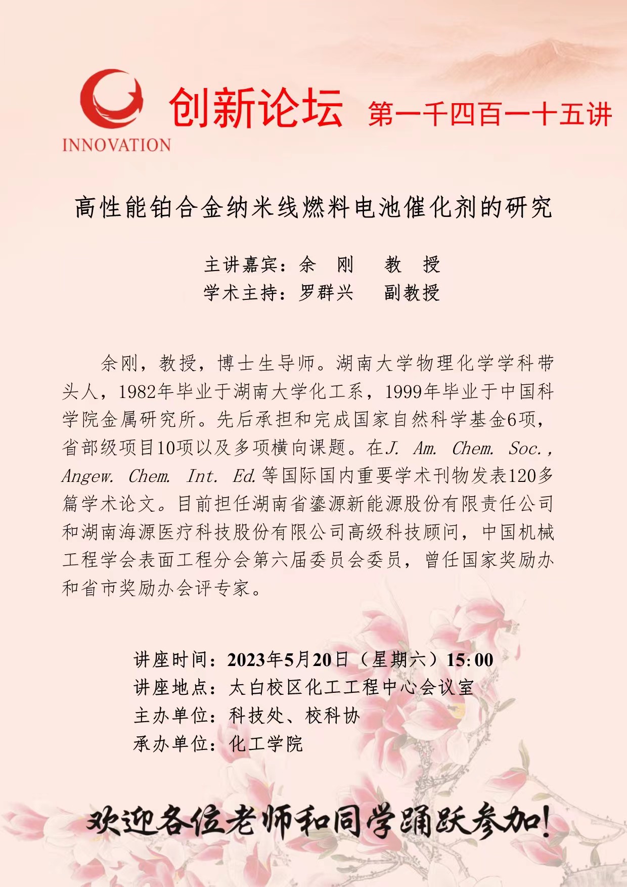余 刚 教 授 8868体育登录创新论坛第一千四百一十五讲:高性能铂合金纳米线燃料电池催化剂的研究 讲座时间 2023年5月20日(星期六)15:00 讲座地点 太白校区化工工程中心会议室 讲座人介绍 余 刚 教 授 讲座内容