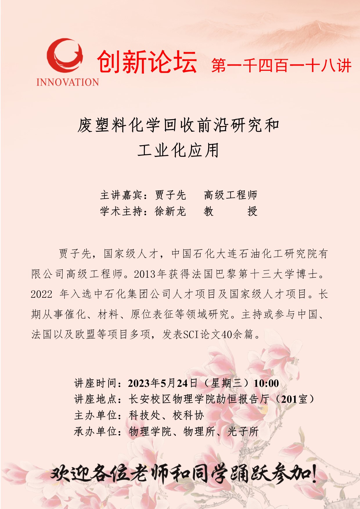 贾子先 高级工程师 8868体育登录创新论坛第一千四百一十八讲:废塑料化学回收前沿研究和工业化应用 讲座时间 2023年5月24日(星期三)10:00 讲座地点 长安校区物理学院劼恒报告厅(201室) 讲座人介绍 贾子先 高级工程师 讲座内容