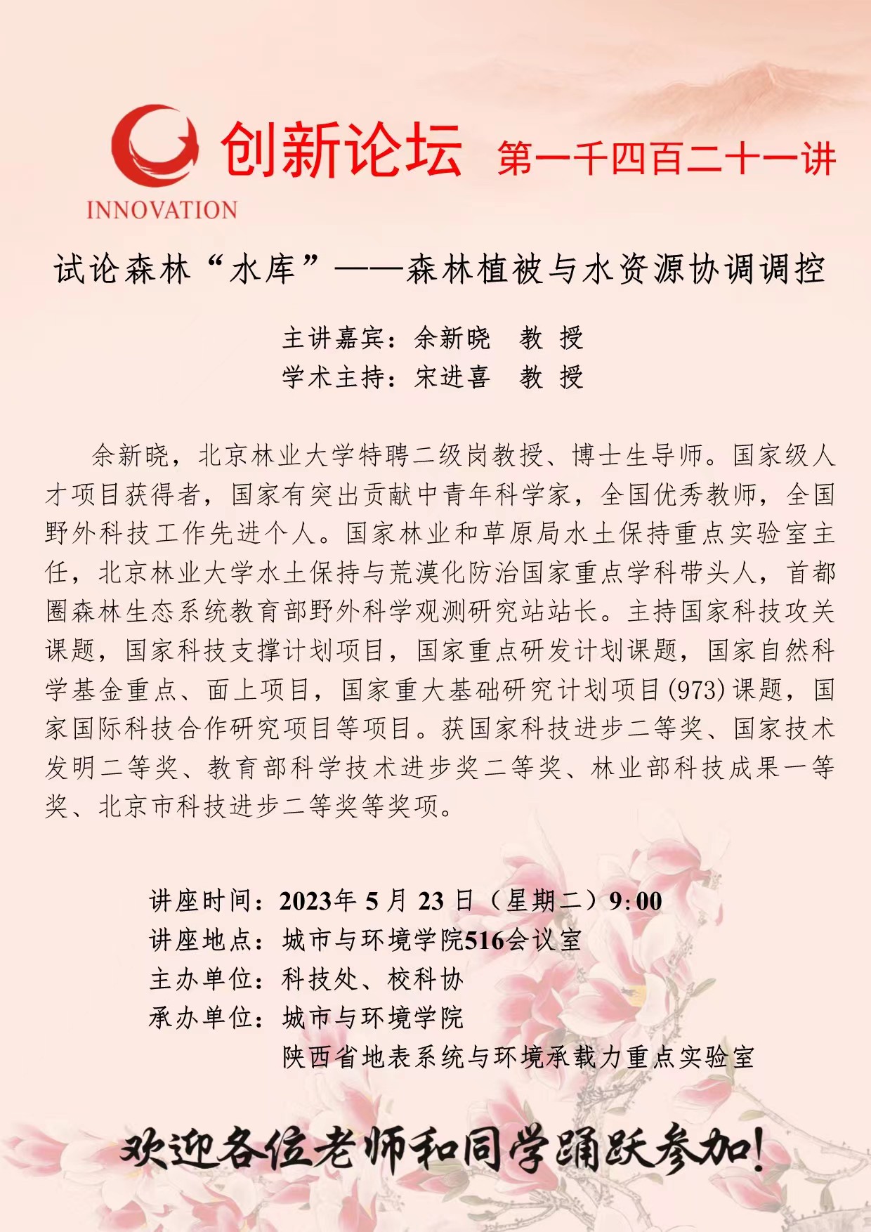 余新晓 教 授 8868体育登录创新论坛第一千四百二十一讲:试论森林“水库”——森林植被与水资源协调调控 讲座时间 2023年5月23日(星期二)9:00 讲座地点 城市与环境学院516会议室 讲座人介绍 余新晓 教 授 讲座内容
