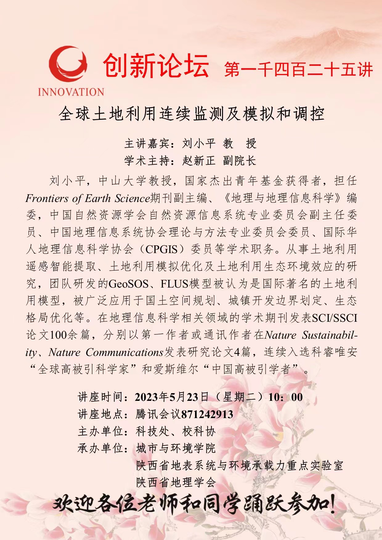 刘小平 教授 8868体育登录创新论坛第一千四百二十五讲:全球土地利用连续监测及模拟和调控优化 讲座时间 2023年5月23日(星期二)10:00 讲座地点 腾讯会议871242913 讲座人介绍 刘小平 教授 讲座内容