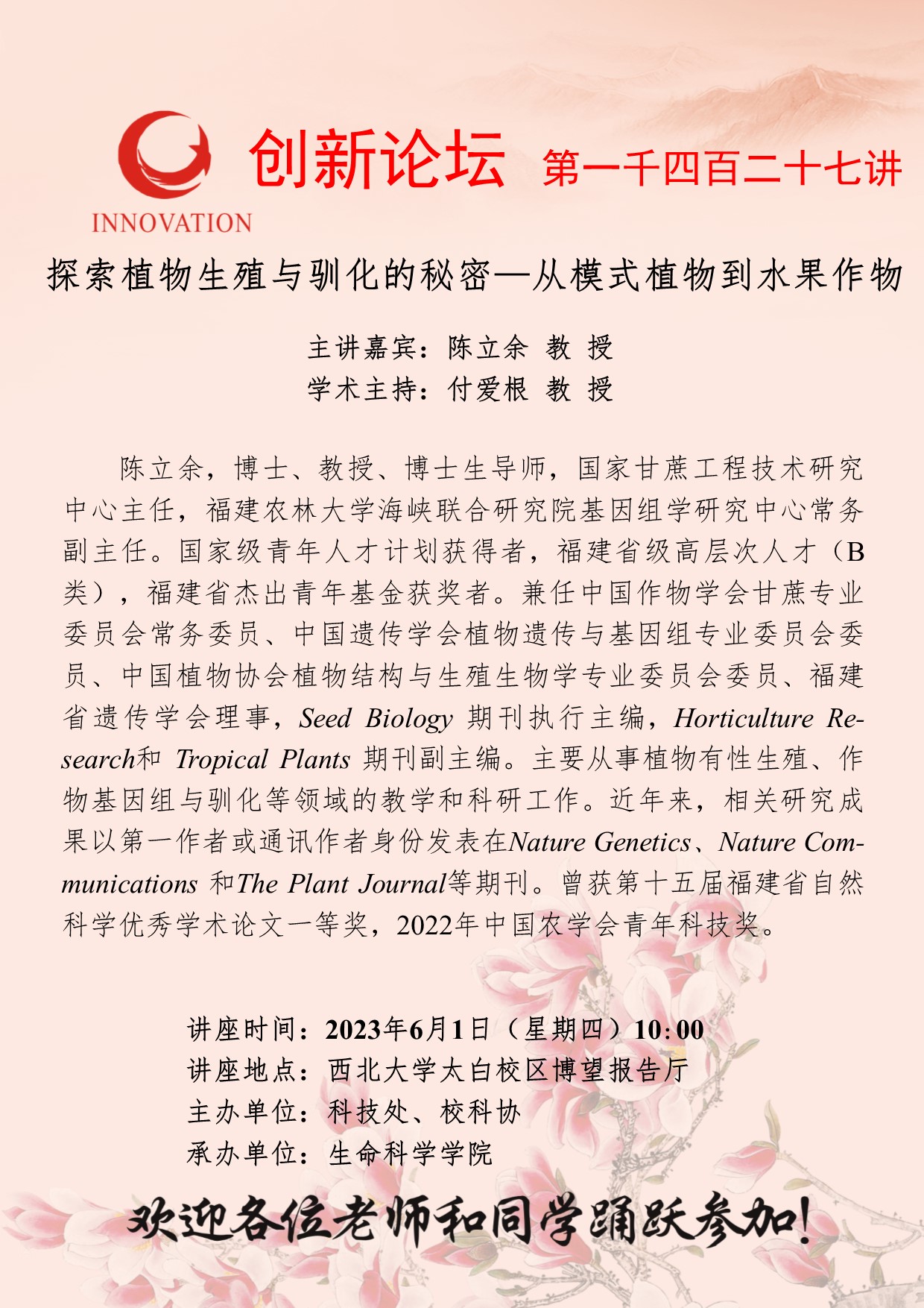 陈立余 教授 8868体育登录创新论坛第一千四百二十七讲:探索植物生殖与驯化的秘密—从模式植物到水果作物 讲座时间 2023年6月1日(星期四)10:00 讲座地点 8868体育登录太白校区博望报告厅 讲座人介绍 陈立余 教授 讲座内容