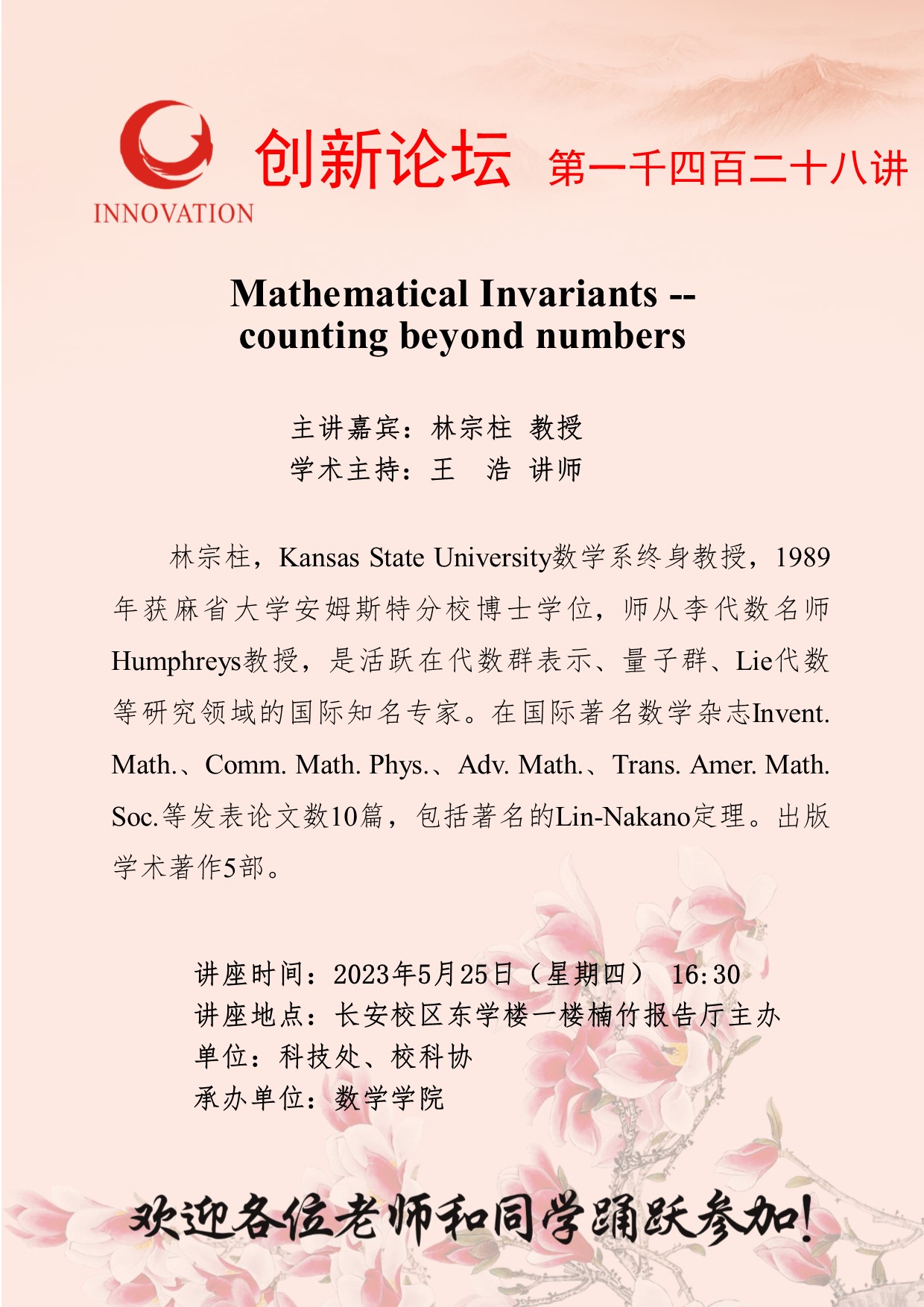 林宗柱 教授 8868体育登录创新论坛第一千四百二十八讲:Mathematical Invariants --counting beyond numbers 讲座时间 2023年5月25日(星期四)16:30 讲座地点 长安校区东学楼一楼楠竹报告厅 讲座人介绍 林宗柱 教授 讲座内容