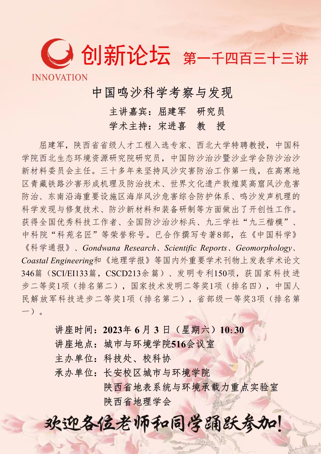 屈建军 研究员 8868体育登录创新论坛第一千四百三十三讲:中国鸣沙科学考察与发现 讲座时间 2023年6月3日(星期六)10:30 讲座地点 城市与环境学院516会议室 讲座人介绍 屈建军 研究员 讲座内容