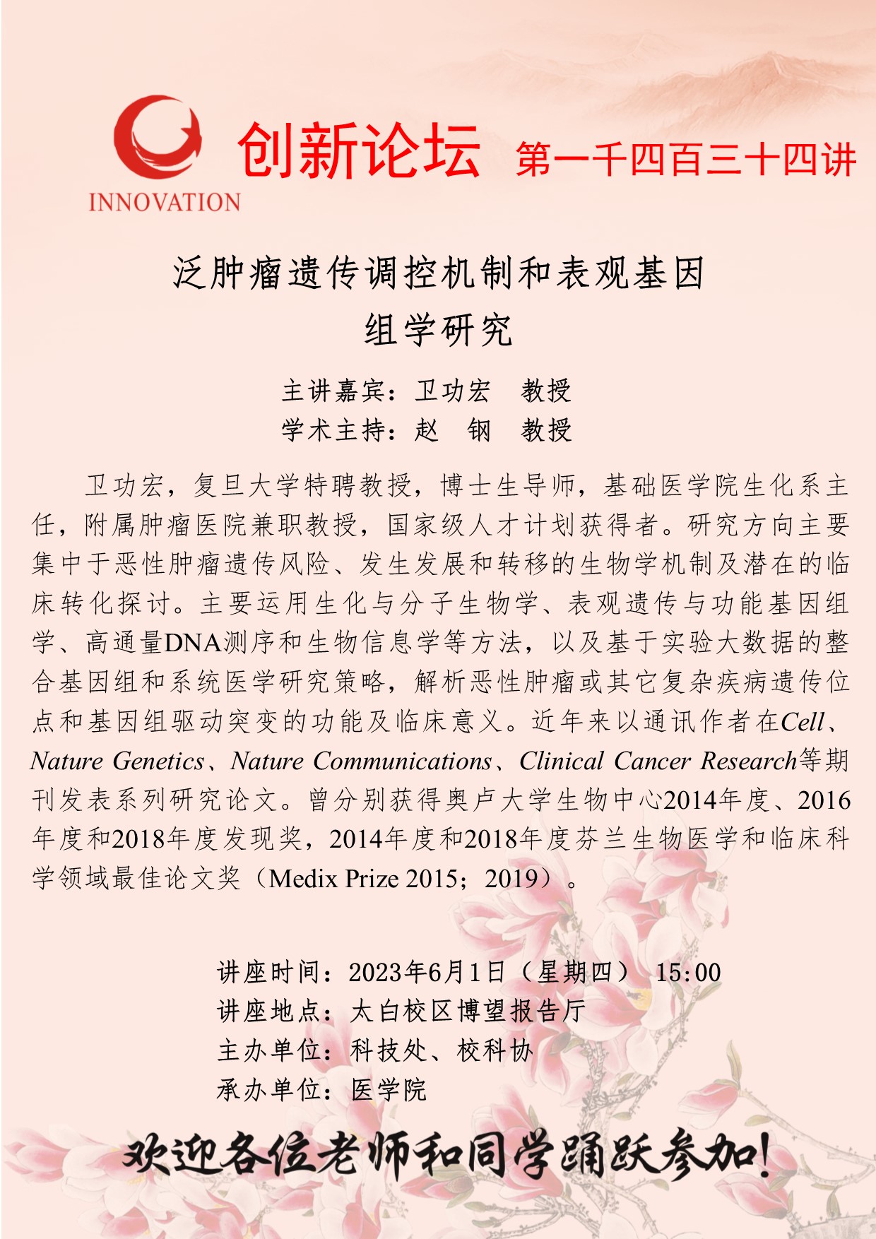 卫功宏 教授 8868体育登录创新论坛第一千四百三十四讲:泛肿瘤遗传调控机制和表观基因组学研究 讲座时间 2023年6月1日(星期四) 15:00 讲座地点 太白校区博望报告厅 讲座人介绍 卫功宏 教授 讲座内容