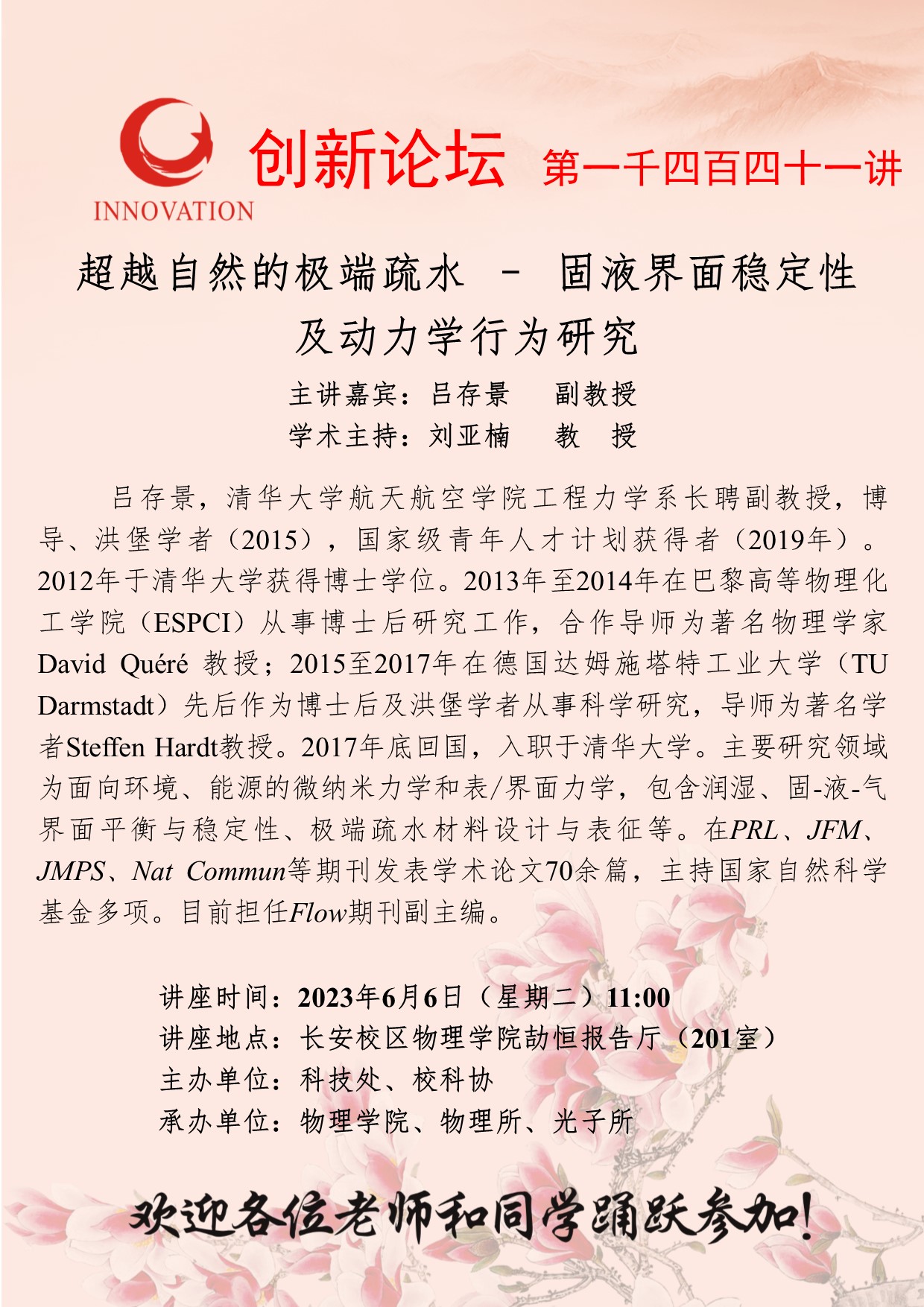 吕存景 副教授 8868体育登录创新论坛第一千四百四十一讲:超越自然的极端疏水 – 固液界面稳定性及动力学行为研究 讲座时间 2023年6月6日(星期二)11:00 讲座地点 长安校区物理学院劼恒报告厅(201室) 讲座人介绍 吕存景 副教授 讲座内容