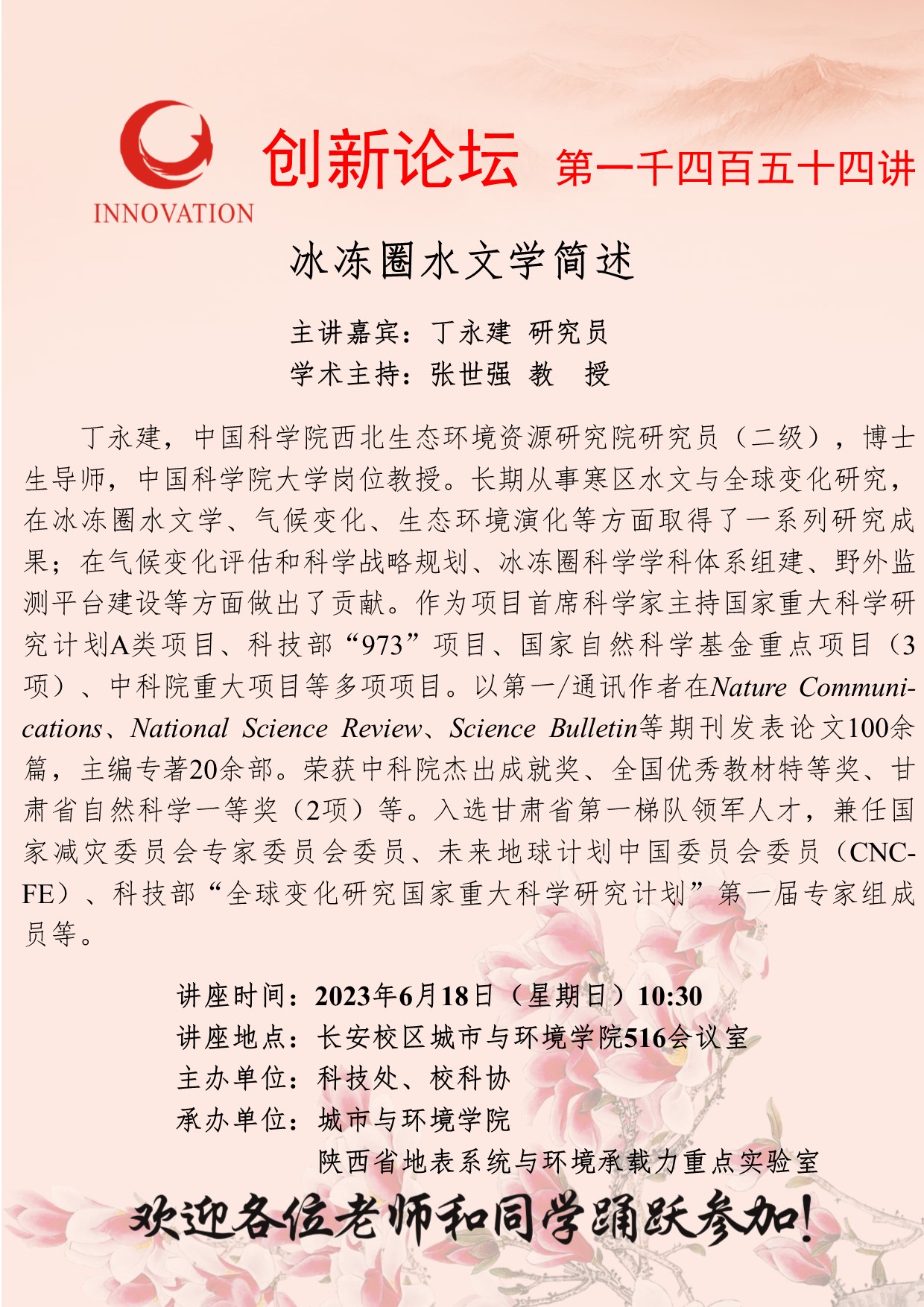 丁永建 研究员 8868体育登录创新论坛第一千四百五十四讲:冰冻圈水文学简述 讲座时间 2023年6月18日(星期日)10:30 讲座地点 长安校区城市与环境学院516会议室 讲座人介绍 丁永建 研究员 讲座内容