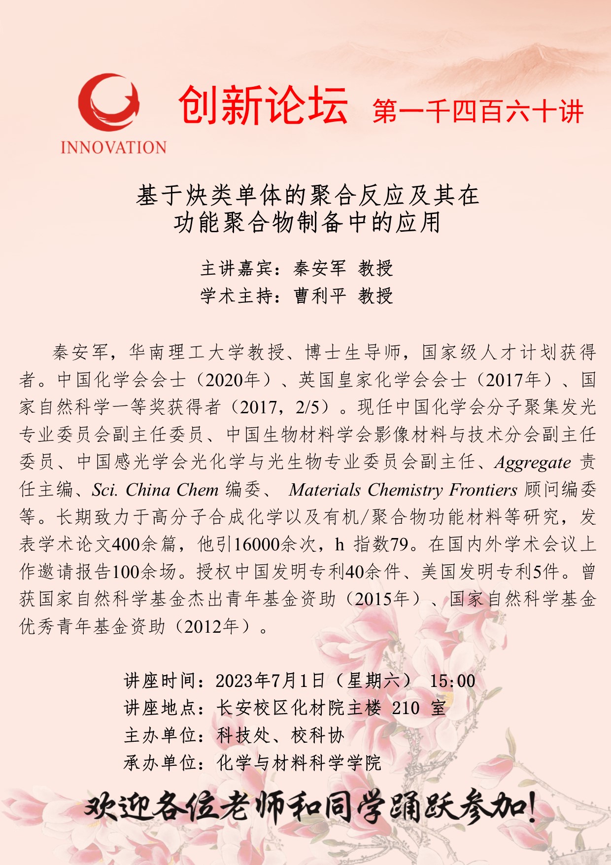 秦安军 教授 8868体育登录创新论坛第一千四百六十讲:基于炔类单体的聚合反应及其在功能聚合物制备中的应用 讲座时间 2023年7月1日(星期六) 15:00 讲座地点 长安校区化材院主楼 210 室 讲座人介绍 秦安军 教授 讲座内容