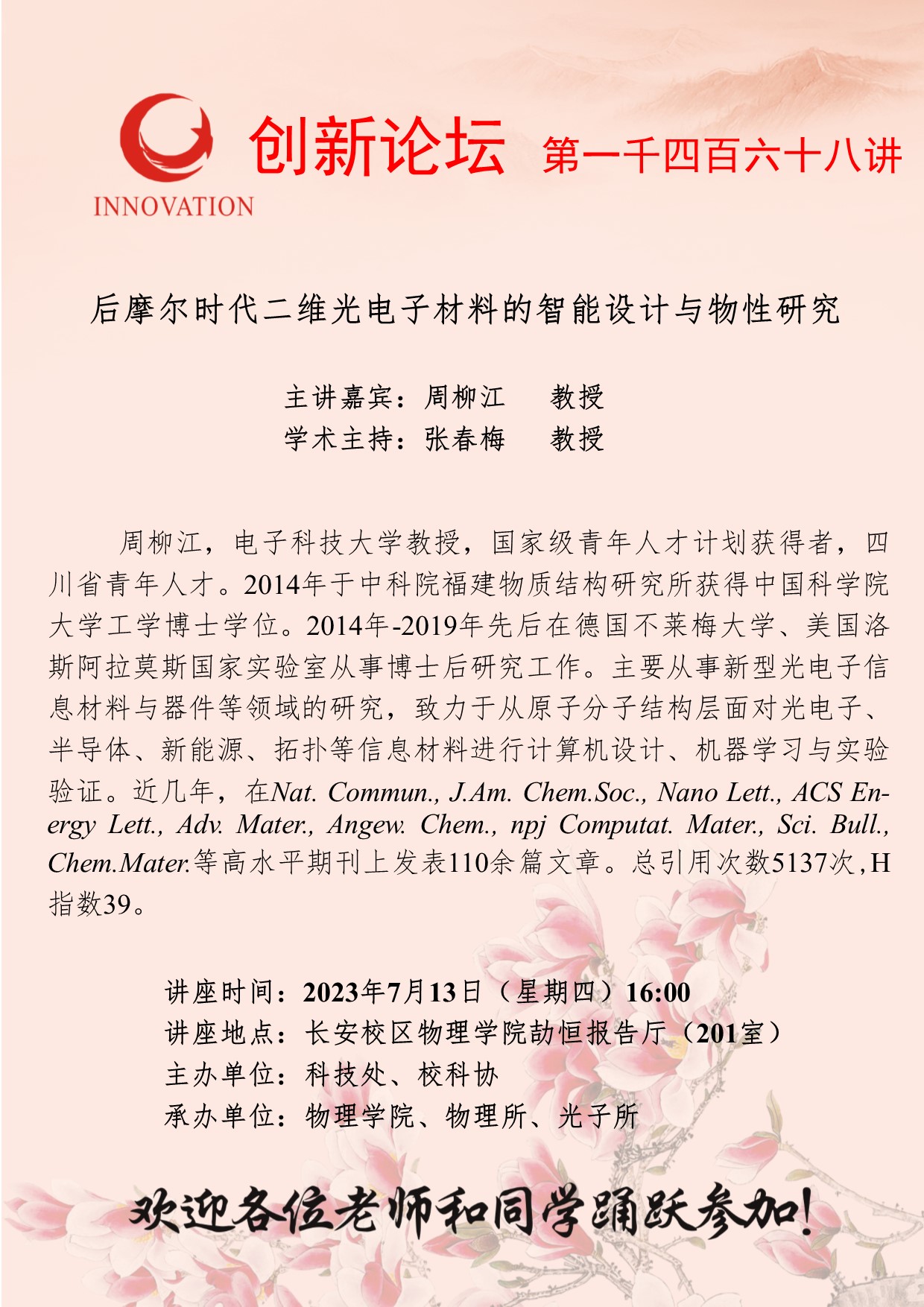 周柳江 教授 8868体育登录创新论坛第一千四百六十八讲:后摩尔时代二维光电子材料的智能设计与物性研究 讲座时间 2023年7月13日(星期四)16:00 讲座地点 长安校区物理学院劼恒报告厅(201室) 讲座人介绍 周柳江 教授 讲座内容