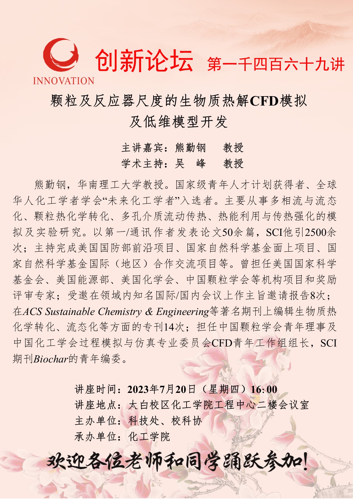 熊勤钢 教授 8868体育登录创新论坛第一千四百六十九讲:颗粒及反应器尺度的生物质热解CFD模拟 讲座时间 2023年7月20日(星期四)16:00 讲座地点 太白校区化工学院工程中心二楼会议室 讲座人介绍 熊勤钢 教授 讲座内容