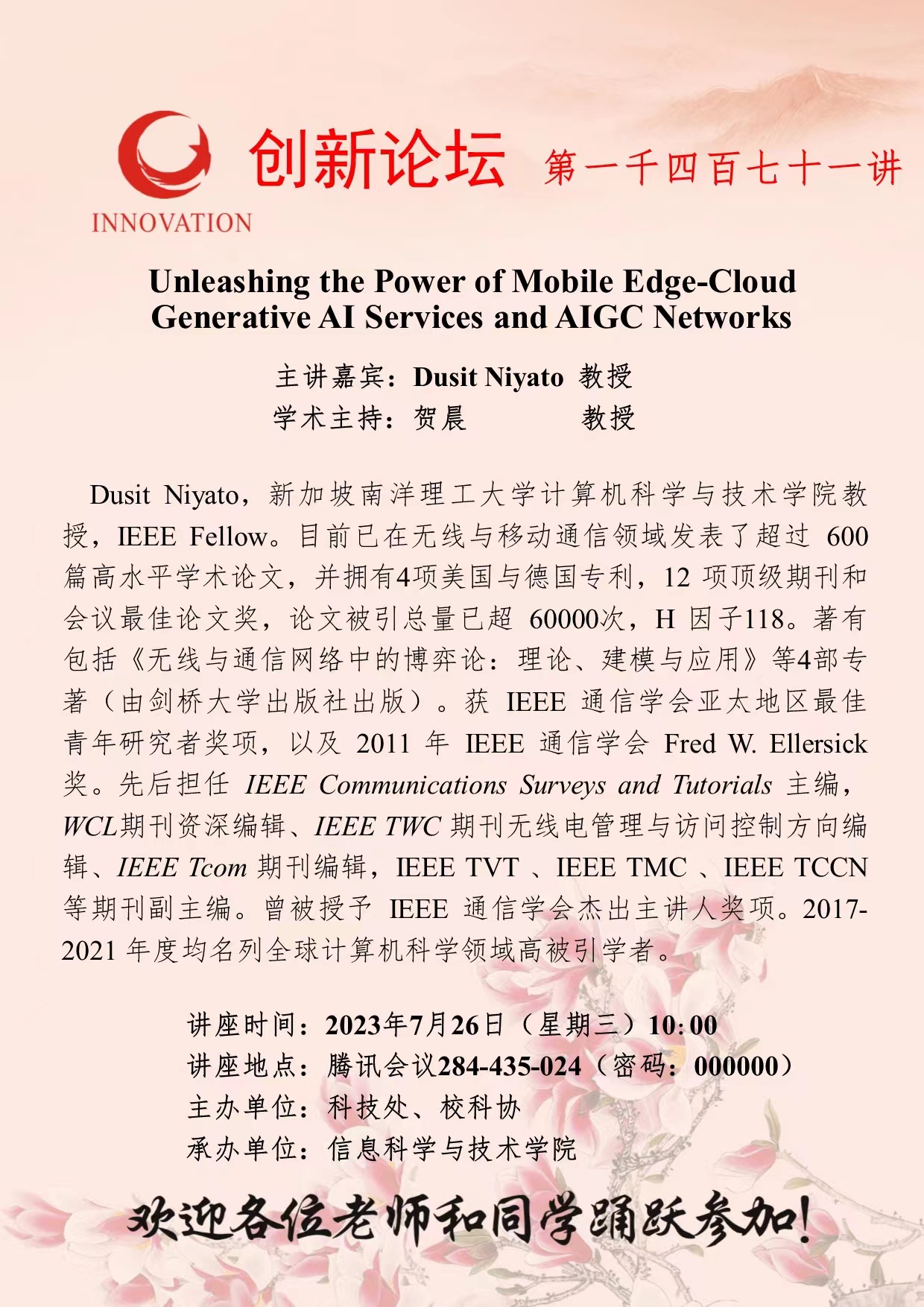 Dusit Niyato 教授 8868体育登录创新论坛第一千四百七十一讲:Unleashing the Power of Mobile Edge-Cloud Generative AI Services and AIGC Networks 讲座时间 2023年7月26日(星期三)10:00 讲座地点 腾讯会议284-435-024(密码:000000) 讲座人介绍 Dusit Niyato 教授 讲座内容