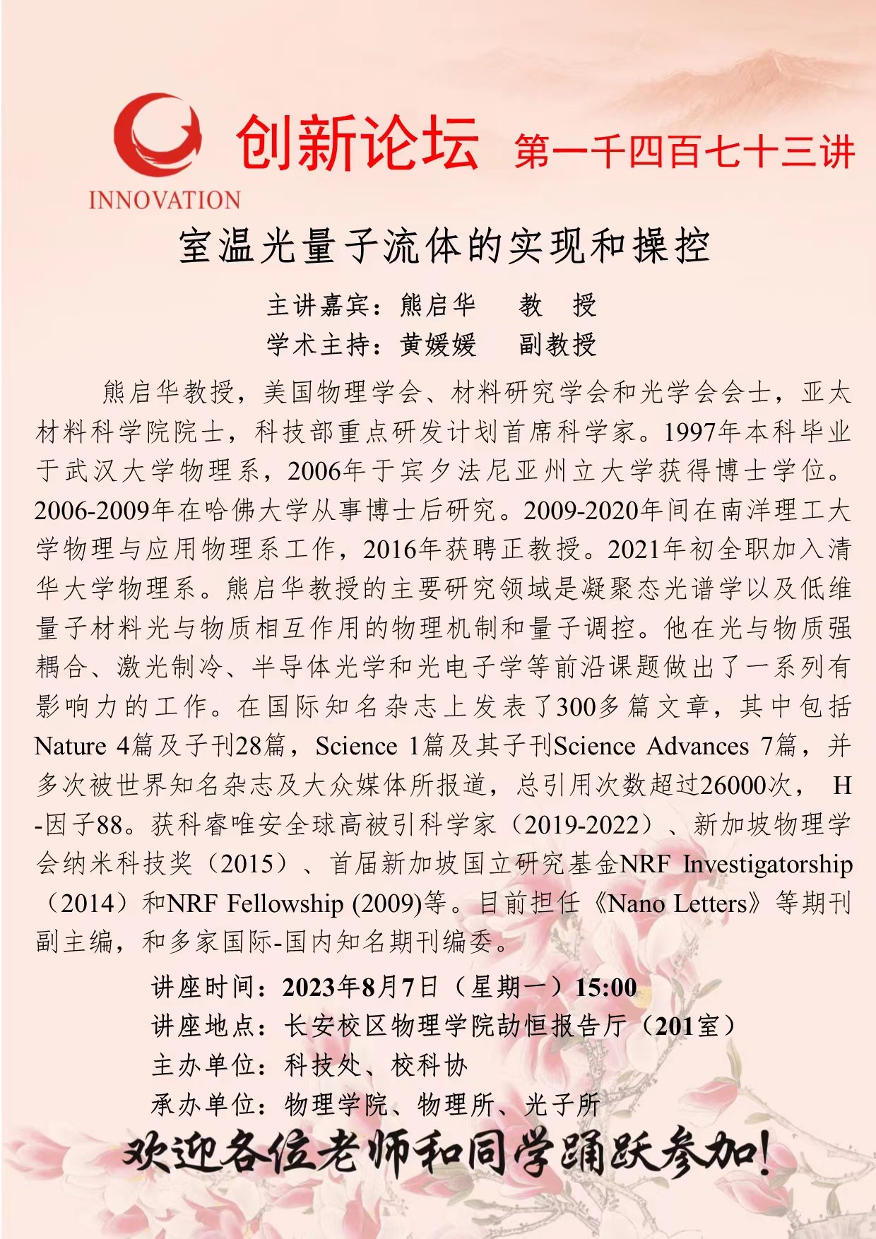 熊启华 教授 8868体育登录创新论坛第一千四百七十三讲:温室光量子流体的实现和操控 讲座时间 2023年8月7日(星期一)15:00 讲座地点 长安校区物理学院劼恒报告厅 讲座人介绍 熊启华 教授 讲座内容