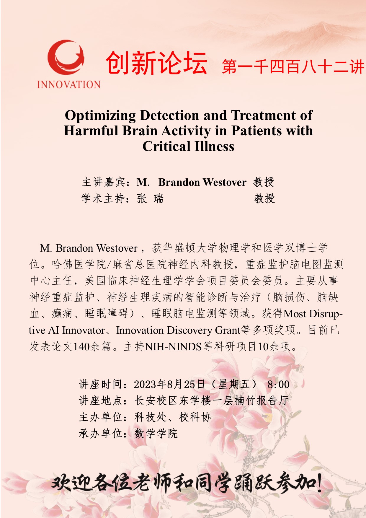 M. Brandon Westover 教授 8868体育登录创新论坛第一千四百八十二讲:Optimizing Detection and Treatment of Harmful Brain Activity in Patients with Critical Illness 讲座时间 2023年8月25日(星期五) 8:00 讲座地点 长安校区东学楼一层楠竹报告厅 讲座人介绍 M. Brandon Westover 教授 讲座内容