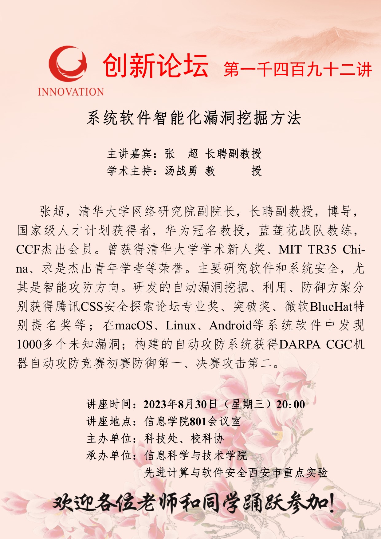 张超 长聘副教授 8868体育登录创新论坛第一千四百九十二讲:系统软件智能化漏洞挖掘方法 讲座时间 2023年8月30日(星期三)20:00 讲座地点 信息学院801会议室 讲座人介绍 张超 长聘副教授 讲座内容