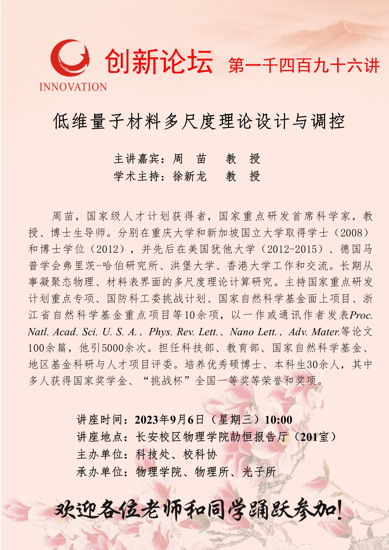 周苗 教授 8868体育登录创新论坛第一千四百九十六讲:低维量子材料多尺度理论设计与调控 讲座时间 2023年9月6日(星期三)10:00 讲座地点 长安校区物理学院劼恒报告厅(201室) 讲座人介绍 周苗 教授 讲座内容