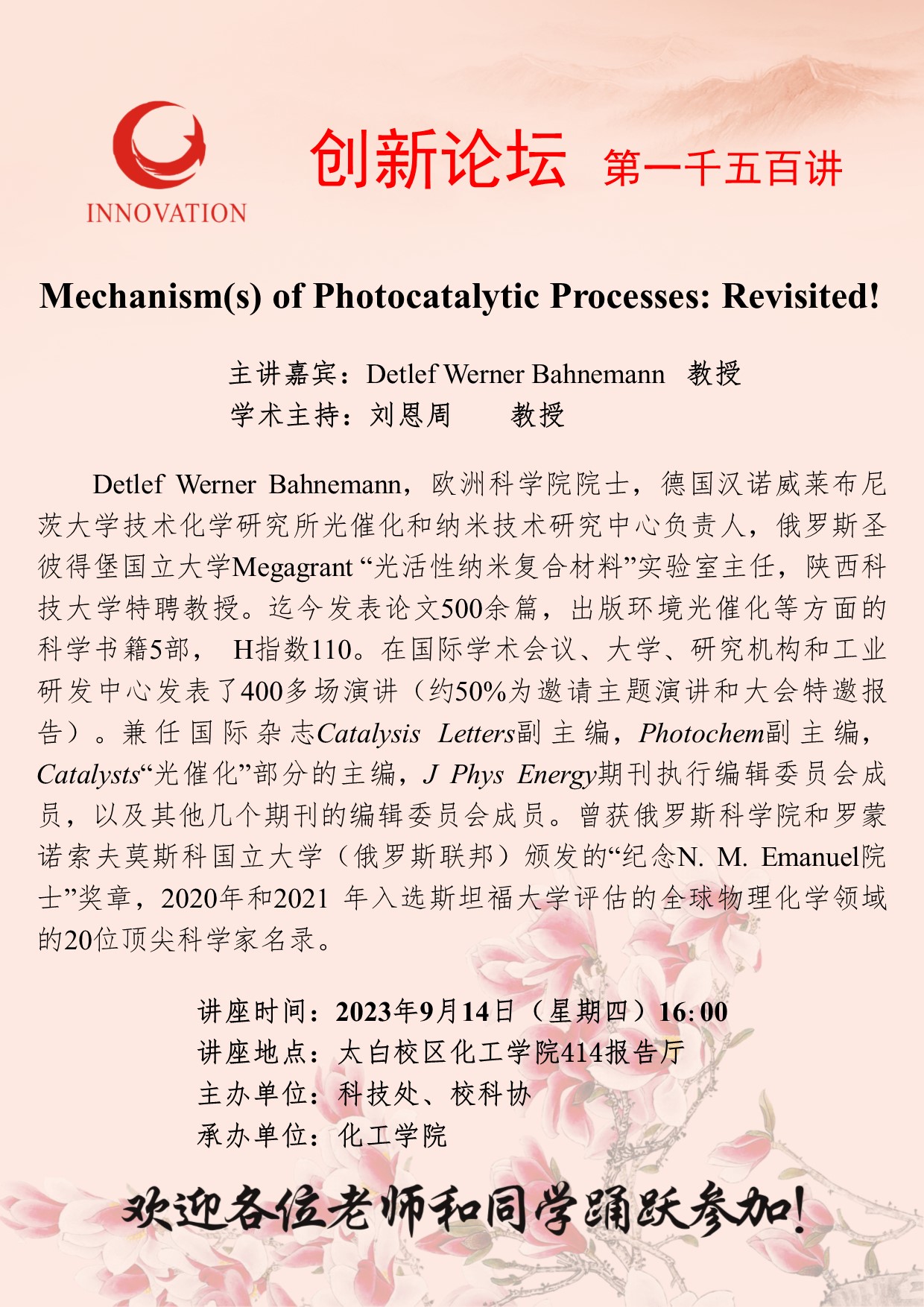 Detlef Werner Bahnemann 教授 8868体育登录创新论坛第一千五百讲:Mechanism(s) of Photocatalytic Processes: Revisited! 讲座时间 2023年9月14日(星期四)16:00 讲座地点 太白校区化工学院414报告厅 讲座人介绍 Detlef Werner Bahnemann 教授 讲座内容