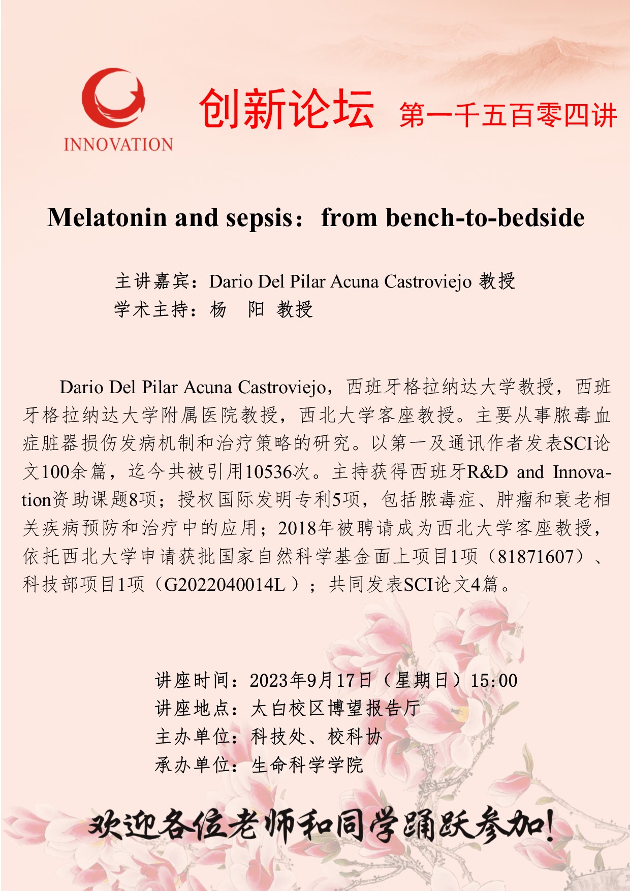 Dario Del Pilar Acuna Castroviejo 教授 8868体育登录创新论坛第一千五百零四讲:Melatonin and sepsis:from bench-to-bedside 讲座时间 2023年9月17日(星期日)15:00 讲座地点 太白校区博望报告厅 讲座人介绍 Dario Del Pilar Acuna Castroviejo 教授 讲座内容
