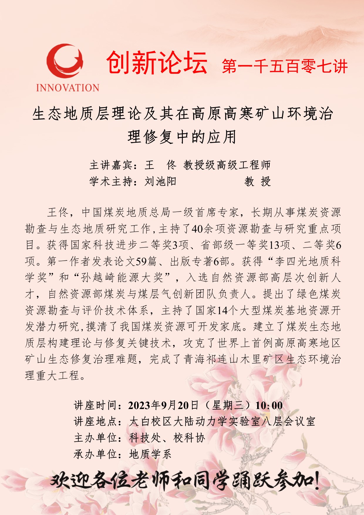 王佟 教授级高级工程师 8868体育登录创新论坛第一千五百零七讲:生态地质层理论及其在高原高寒矿山环境治理修复中的应用 讲座时间 2023年9月20日(星期三)10:00 讲座地点 太白校区大陆动力学实验室八层会议室 讲座人介绍 王佟 教授级高级工程师 讲座内容