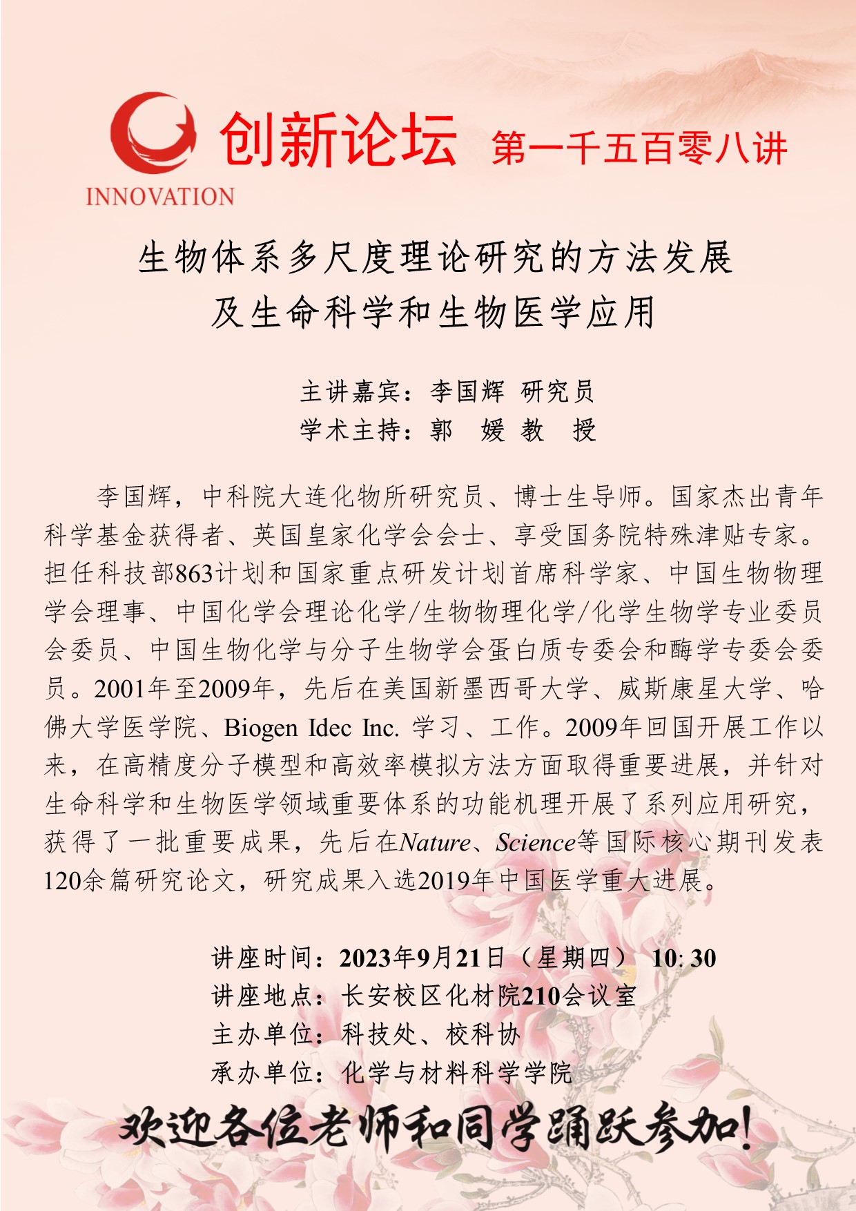 李国辉 研究员 8868体育登录创新论坛第一千五百零八讲:生物体系多尺度理论研究的方法发展及生命科学和生物医学应用 讲座时间 2023年9月21日(星期四) 10: 30 讲座地点 长安校区化材院210会议室 讲座人介绍 李国辉 研究员 讲座内容