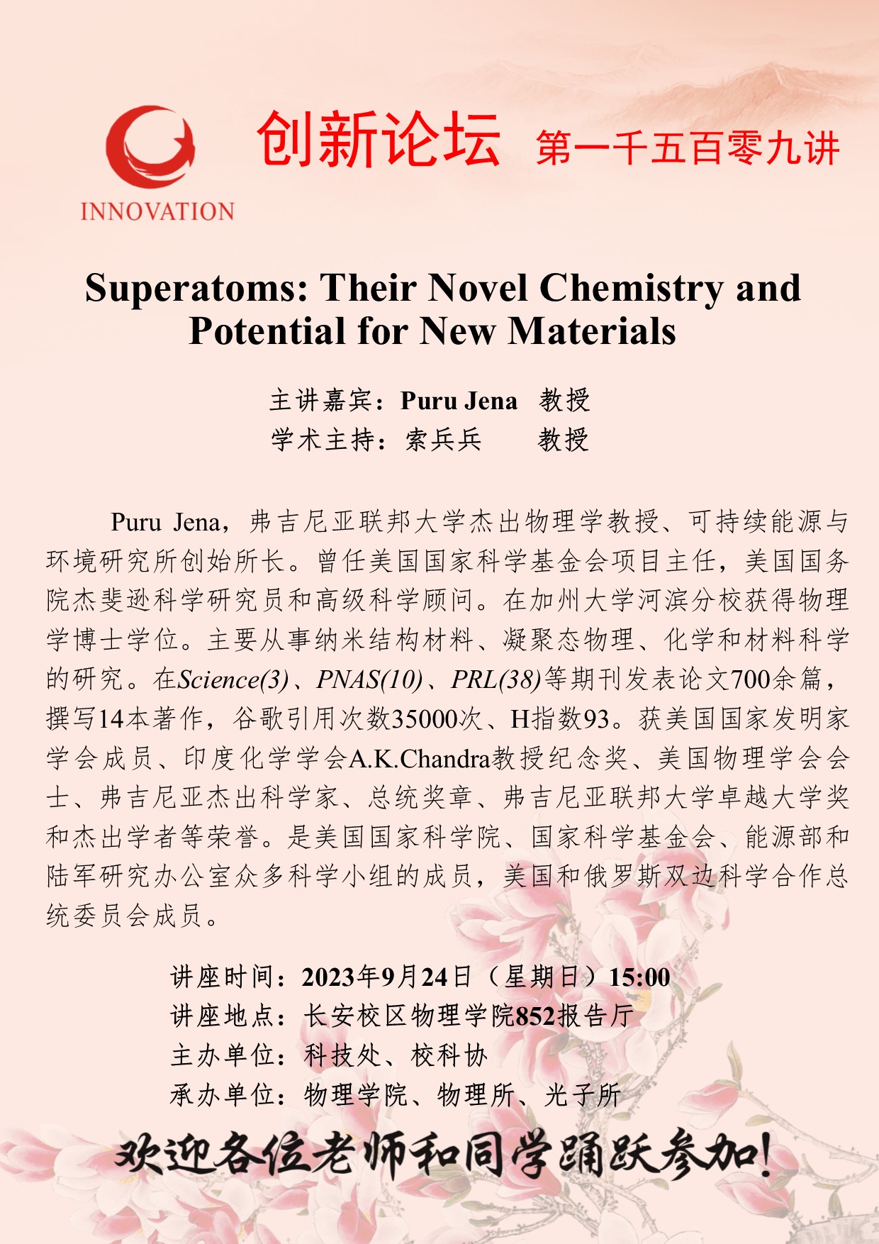 Puru Jena 教授 8868体育登录创新论坛第一千五百零九讲:Superatoms: Their Novel Chemistry and Potential for New Materials 讲座时间 2023年9月24日(星期日)15:00 讲座地点 长安校区物理学院852报告厅 讲座人介绍 Puru Jena 教授 讲座内容