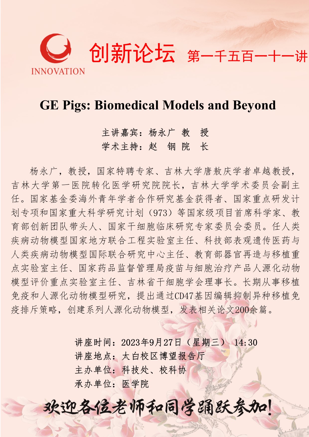 杨永广 教 授 8868体育登录创新论坛第一千五百一十一讲:GE Pigs: Biomedical Models and Beyond 讲座时间 2023年9月27日(星期三) 14:30 讲座地点 太白校区博望报告厅 讲座人介绍 杨永广 教 授 讲座内容