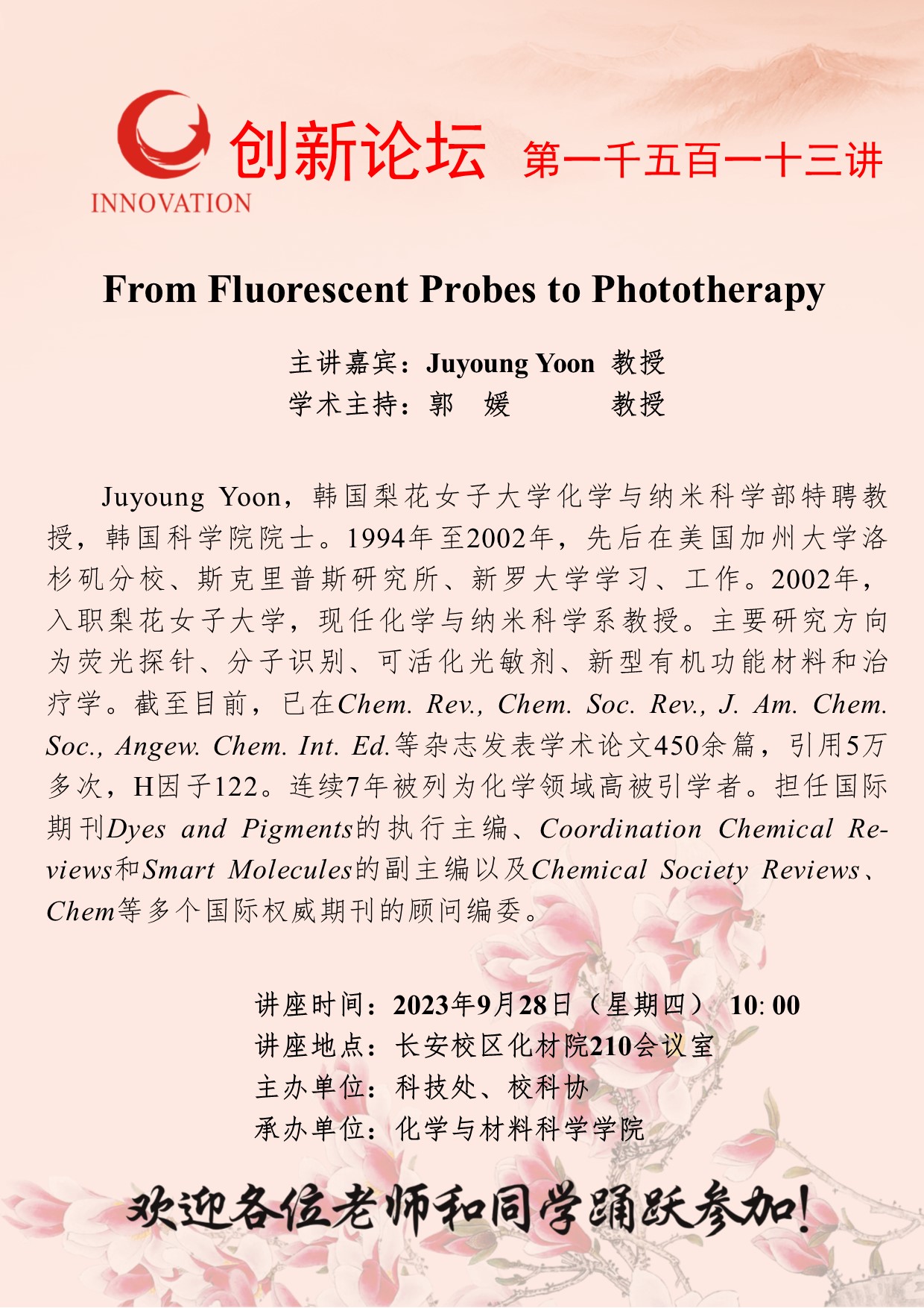 Juyoung Yoon 教授 8868体育登录创新论坛第一千五百一十三讲:From Fluorescent Probes to Phototherapy 讲座时间 2023年9月28日(星期四) 10: 00 讲座地点 长安校区化材院210会议室 讲座人介绍 Juyoung Yoon 教授 讲座内容