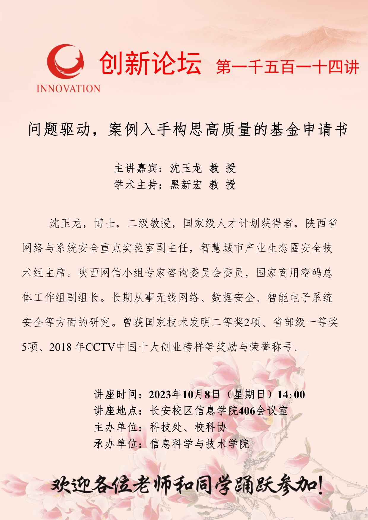 沈玉龙 教 授 8868体育登录创新论坛第一千五百一十四讲: 问题驱动,案例入手构思高质量的基金申请书 讲座时间 2023年10月8日(星期日)14:00 讲座地点 长安校区信息学院406会议室 讲座人介绍 沈玉龙 教 授 讲座内容