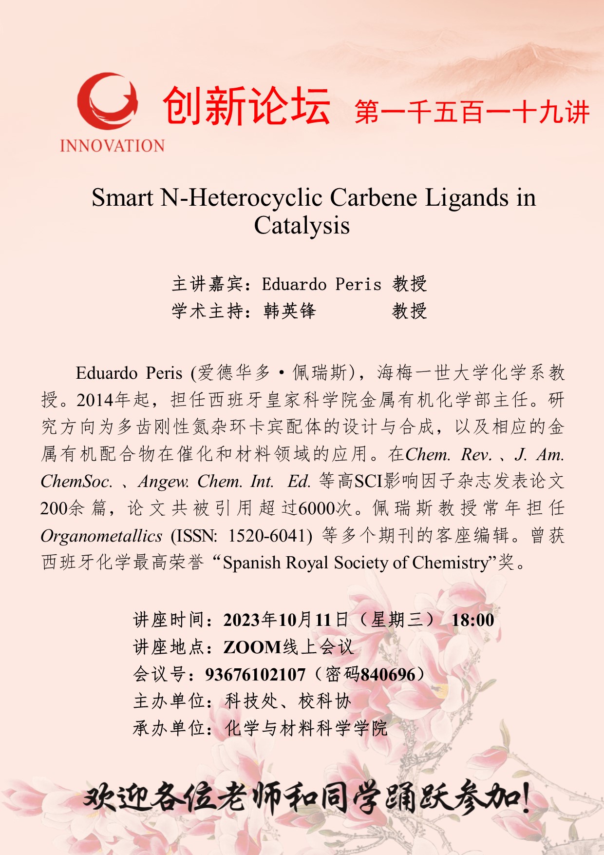 Eduardo Peris 教授 8868体育登录创新论坛第一千五百一十九讲: Smart N-Heterocyclic Carbene Ligands in Catalysis 讲座时间 2023年10月11日(星期三) 18:00 讲座地点 ZOOM线上会议 讲座人介绍 Eduardo Peris 教授 讲座内容