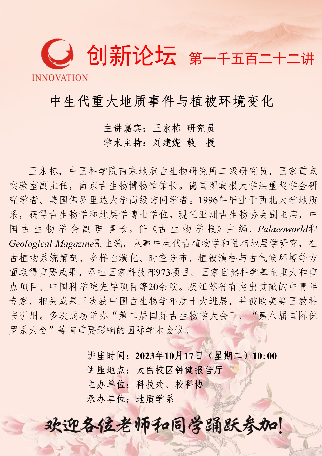 王永栋 研究员 8868体育登录创新论坛第一千五百二十二讲:中生代重大地质事件与植被环境变化 讲座时间 2023年10月17日(星期二)10:00 讲座地点 太白校区钟健报告厅 讲座人介绍 王永栋 研究员 讲座内容