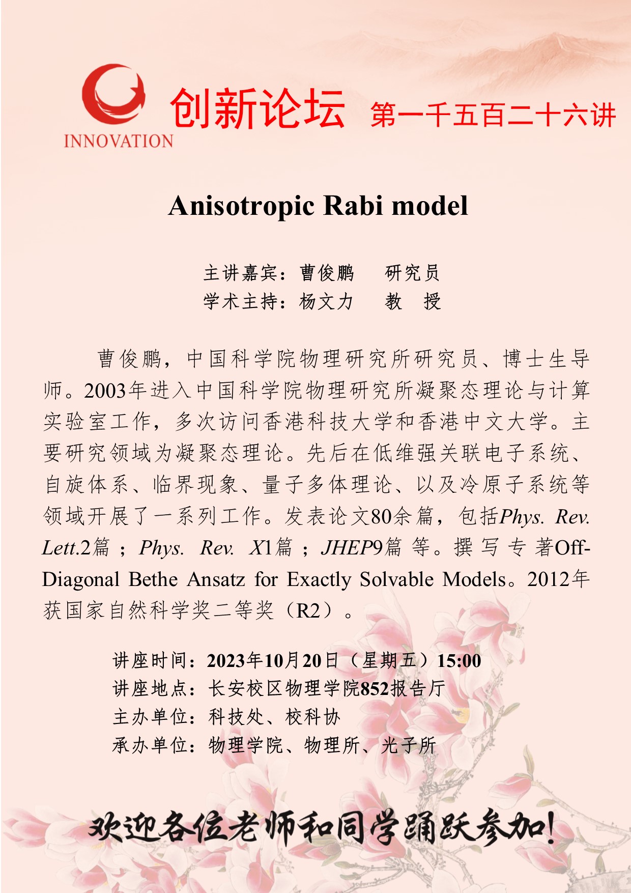 曹俊鹏 研究员 8868体育登录创新论坛第一千五百二十六讲:Anisotropic Rabi model 讲座时间 2023年10月20日(星期五)15:00 讲座地点 长安校区物理学院852报告厅 讲座人介绍 曹俊鹏 研究员 讲座内容