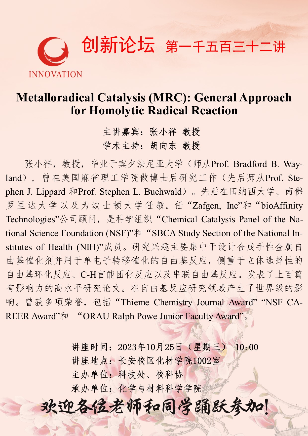 张小祥 教授 8868体育登录创新论坛第一千五百三十二讲:Metalloradical Catalysis (MRC): General Approach for Homolytic Radical Reaction 讲座时间 2023年10月25日(星期三) 10:00 讲座地点 长安校区化材学院1002室 讲座人介绍 张小祥 教授 讲座内容