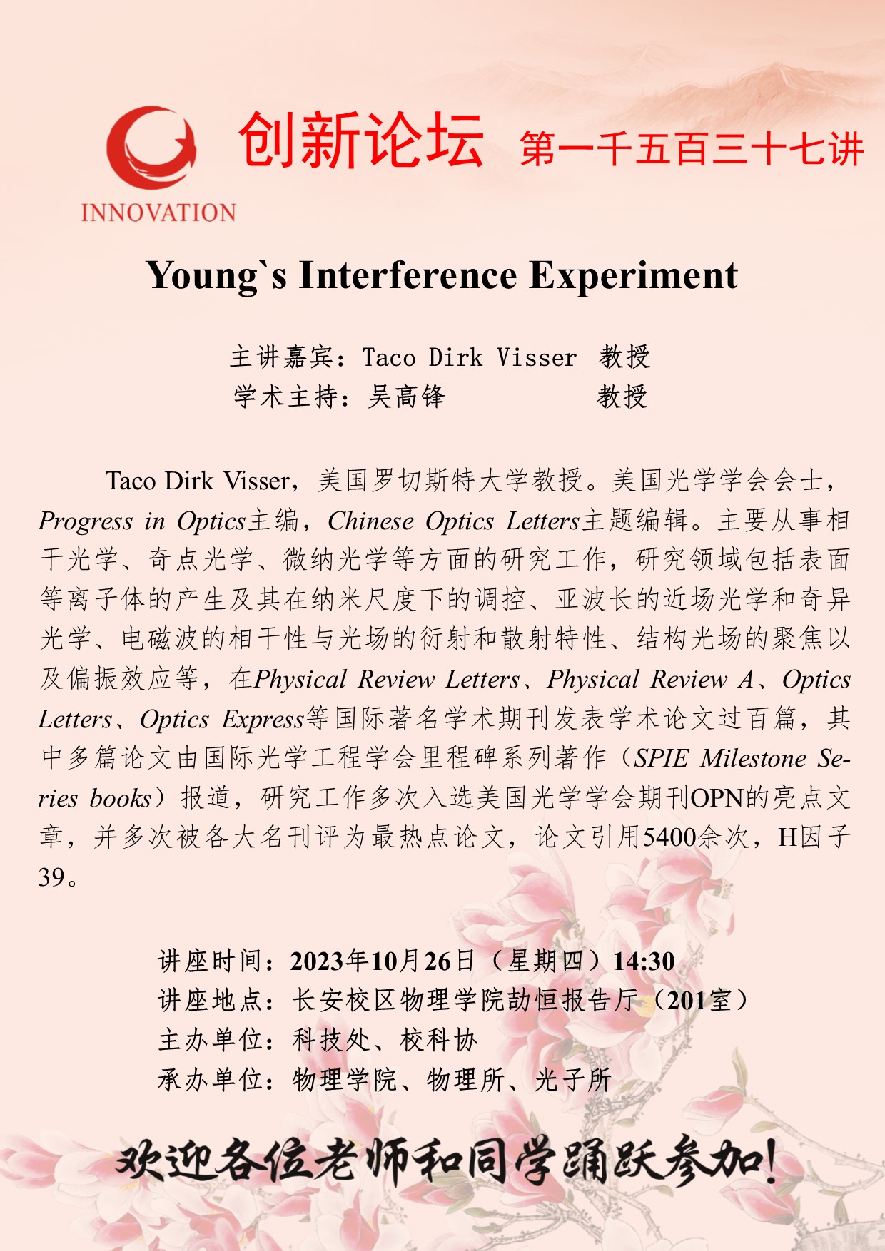 Taco Dirk Visser 教授 8868体育登录创新论坛第一千五百三十七讲:Young`s Interference Experiment 讲座时间 2023年10月26日(星期四)14:30 讲座地点 长安校区物理学院劼恒报告厅(201室) 讲座人介绍 Taco Dirk Visser 教授 讲座内容