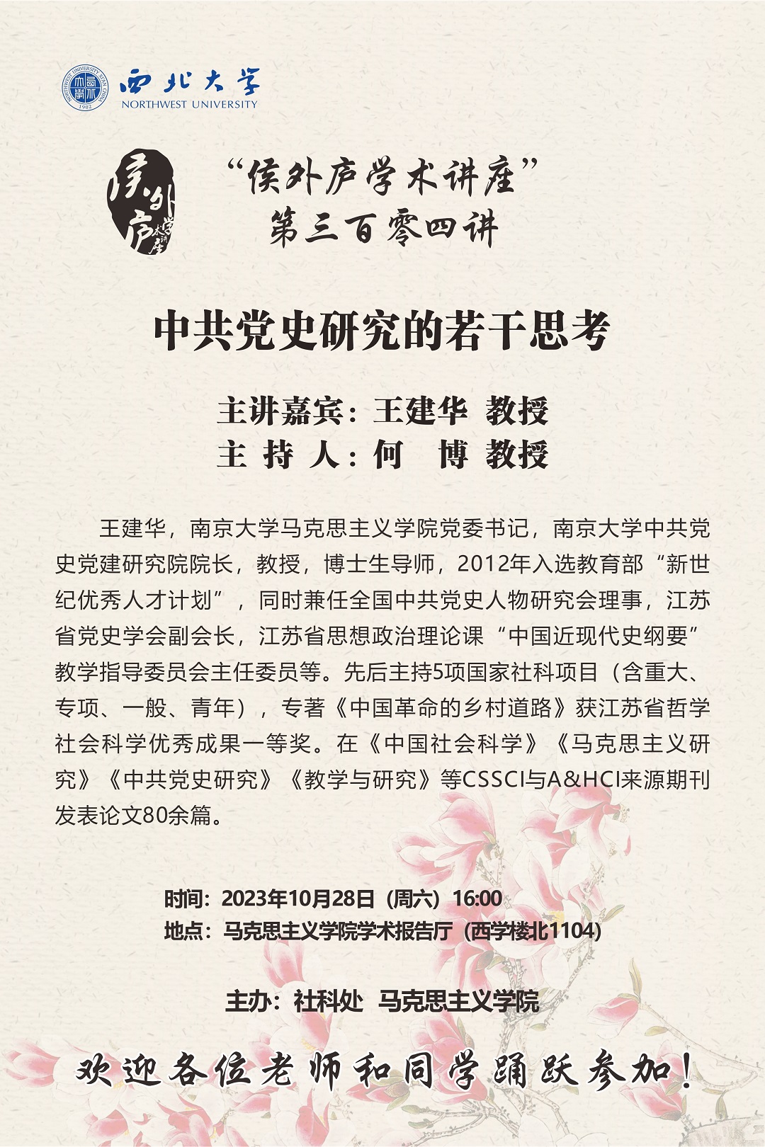 王建华 教授 侯外庐学术讲座第三百零四讲:中共党史研究的若干思考 讲座时间 2023年10月28日(周六)16:00 讲座地点 马克思主义学院学术报告厅(西学楼北1104) 讲座人介绍 王建华 教授 讲座内容