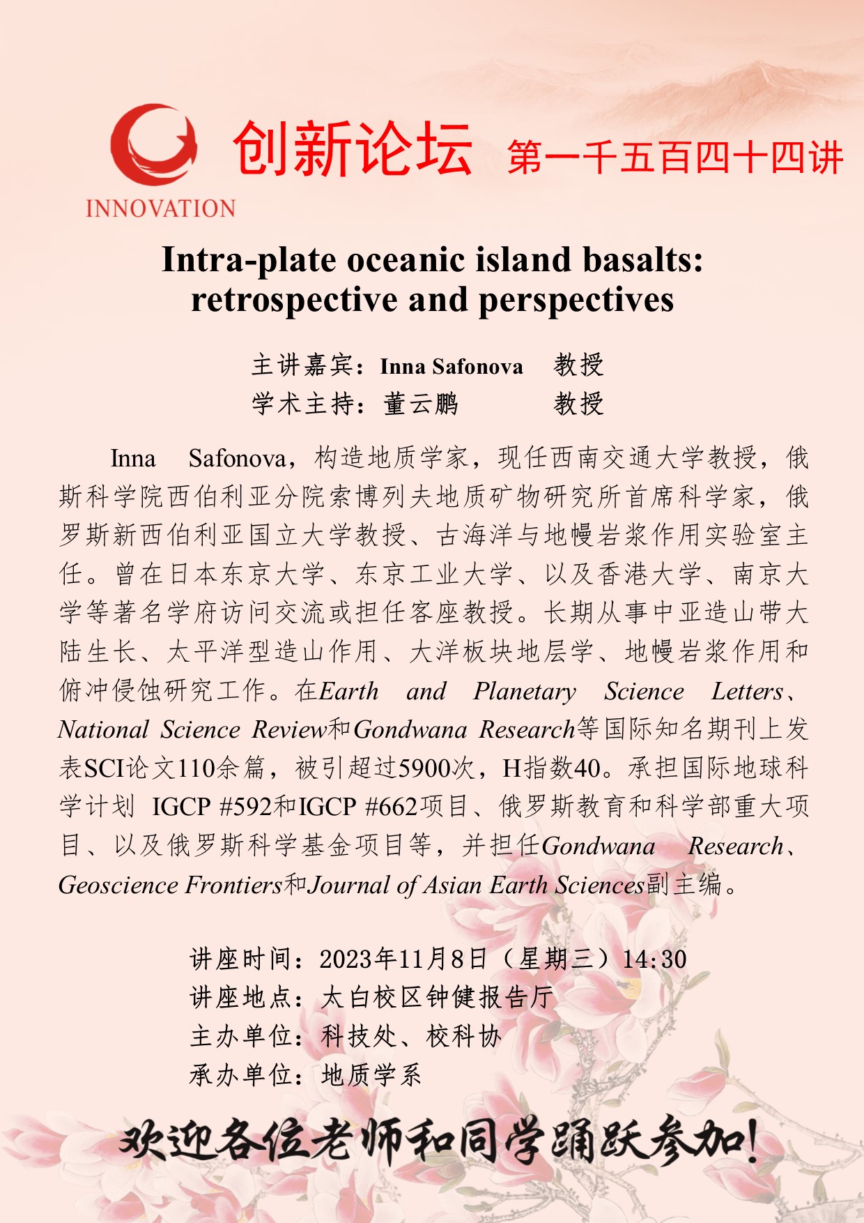 Inna Safonova 教授 8868体育登录创新论坛第一千五百四十四讲:Intra-plate oceanic island basalts: retrospective and perspectives 讲座时间 2023年11月8日(星期三)14:30 讲座地点 太白校区钟健报告厅 讲座人介绍 Inna Safonova 教授 讲座内容