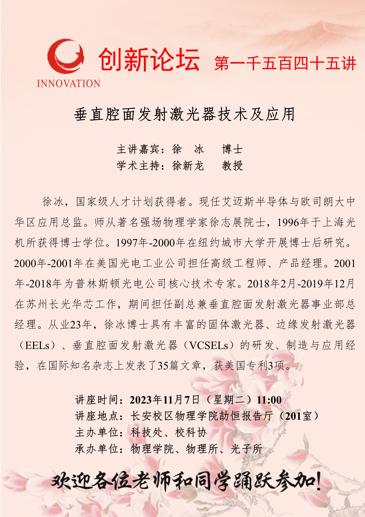徐冰 博士 8868体育登录创新论坛第一千五百四十五讲:垂直腔面发射激光器技术及应用 讲座时间 2023年11月7日(星期二)11:00 讲座地点 长安校区物理学院劼恒报告厅(201室) 讲座人介绍 徐冰 博士 讲座内容
