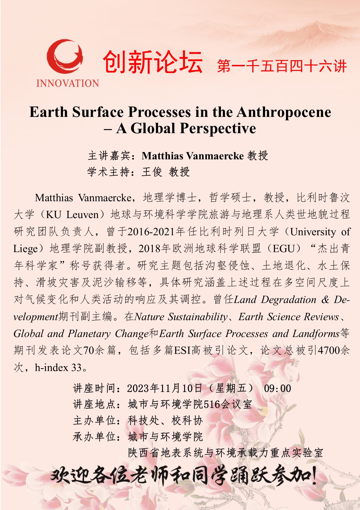Matthias Vanmaercke 教授 8868体育登录创新论坛第一千五百四十六讲:Earth Surface Processes in the Anthropocene – A Global Perspective 讲座时间 2023年11月10日(星期五) 09:00 讲座地点 城市与环境学院516会议室 讲座人介绍 Matthias Vanmaercke 教授 讲座内容