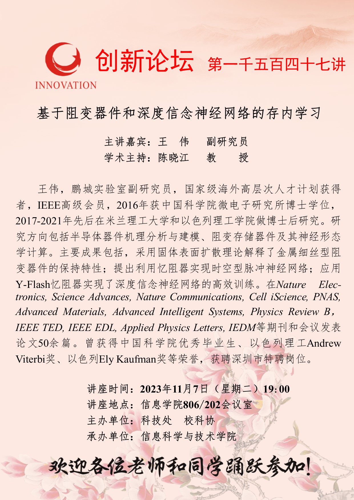 王 伟 副研究员 8868体育登录创新论坛第一千五百四十七讲:基于阻变器件和深度信念神经网络的存内学习 讲座时间 2023年11月7日(星期二)19:00 讲座地点 信息学院806/202会议室 讲座人介绍 王 伟 副研究员 讲座内容