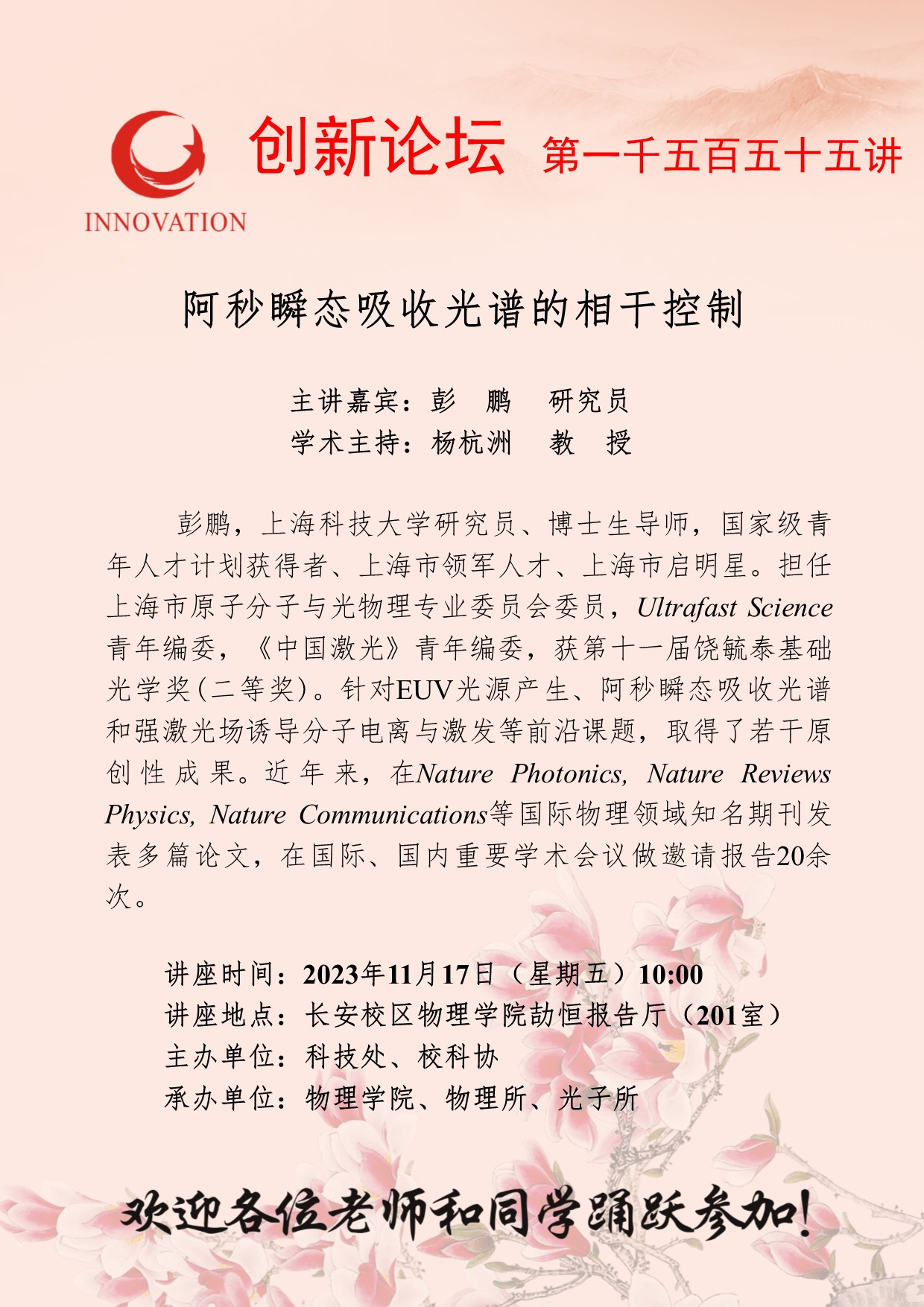 彭鹏 研究员 8868体育登录创新论坛第一千五百五十五讲:阿秒瞬态吸收光谱的相干控制 讲座时间 2023年11月17日(星期五)10:00 讲座地点 长安校区物理学院劼恒报告厅(201室) 讲座人介绍 彭鹏 研究员 讲座内容