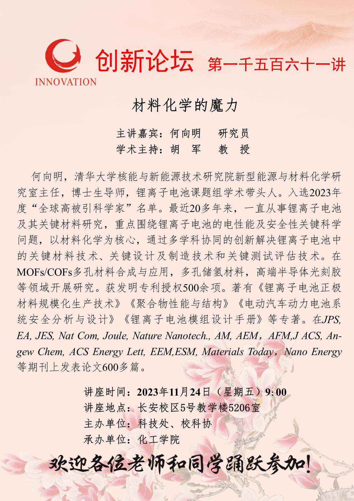 何向明 研究员 8868体育登录创新论坛第一千五百六十一讲:材料化学的魔力 讲座时间 2023年11月24日(星期五)9:00 讲座地点 长安校区5号教学楼5206室 讲座人介绍 何向明 研究员 讲座内容