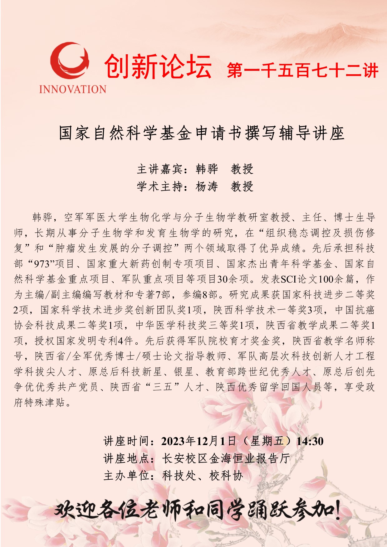 韩骅 教授 8868体育登录创新论坛第一千五百七十二讲:国家自然科学基金申请书撰写辅导讲座 讲座时间 2023年12月1日(星期五)14:30 讲座地点 长安校区金海恒业报告厅 讲座人介绍 韩骅 教授 讲座内容