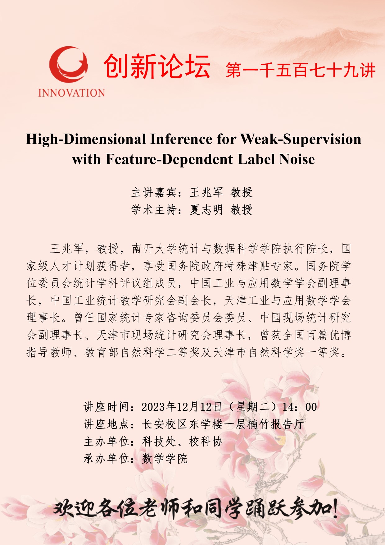 王兆军 教授 8868体育登录创新论坛第一千五百七十九讲:High-Dimensional Inference for Weak-Supervision with Feature-Dependent Label Noise 讲座时间 2023年12月12日(星期二)14:00 讲座地点 长安校区东学楼一层楠竹报告厅 讲座人介绍 王兆军 教授 讲座内容