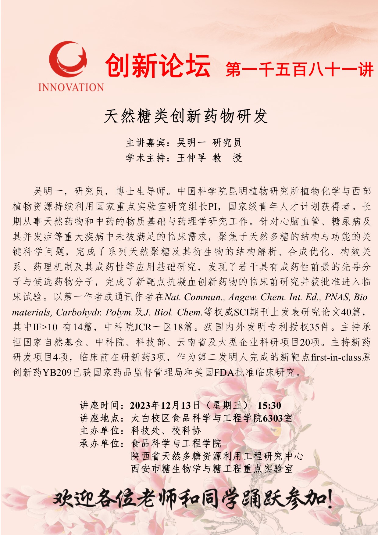 吴明一 研究员 8868体育登录创新论坛第一千五百八十一讲:天然糖类创新药物研发 讲座时间 2023年12月13日(星期三) 15:30 讲座地点 太白校区食品科学与工程学院6303室 讲座人介绍 吴明一 研究员 讲座内容