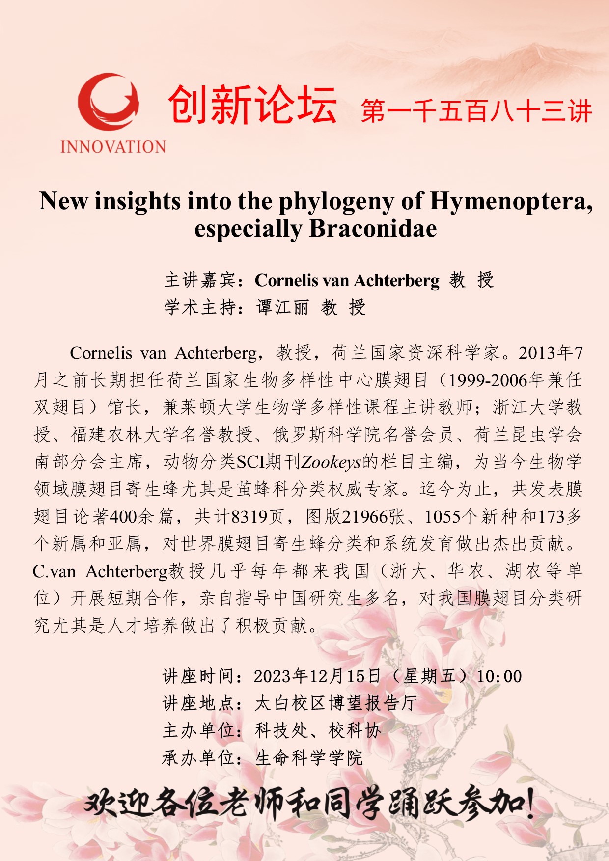 Cornelis van Achterberg 教 授 8868体育登录创新论坛第一千五百八十三讲:New insights into the phylogeny of Hymenoptera, especially Braconidae 讲座时间 2023年12月15日(星期五)10:00 讲座地点 太白校区博望报告厅 讲座人介绍 Cornelis van Achterberg 教 授 讲座内容