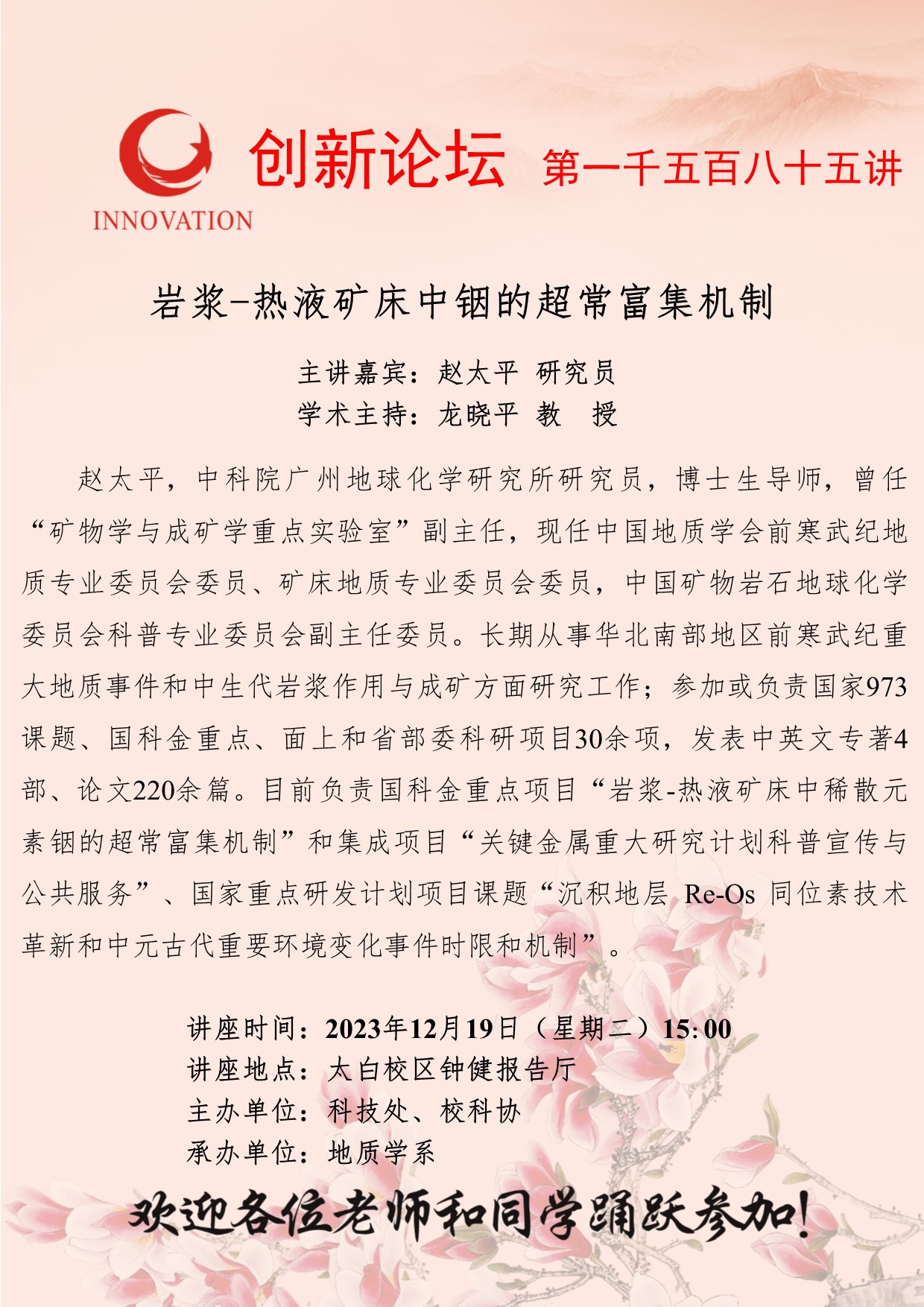 赵太平 研究员 8868体育登录创新论坛第一千五百八十五讲:岩浆-热液矿床中铟的超常富集机制 讲座时间 2023年12月19日(星期二)15:00 讲座地点 太白校区钟健报告厅 讲座人介绍 赵太平 研究员 讲座内容
