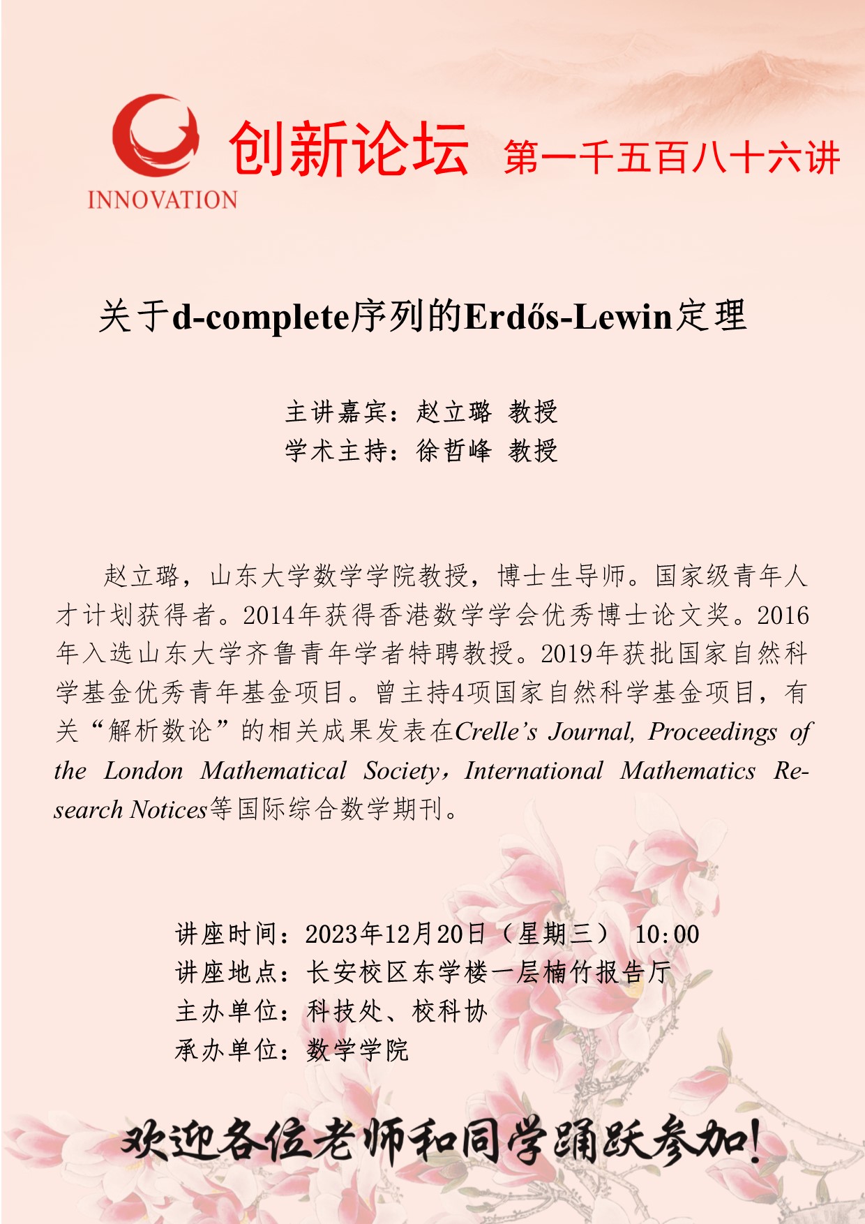 赵立璐 教授 8868体育登录创新论坛第一千五百八十六讲:关于d-complete序列的Erdős-Lewin定理 讲座时间 2023年12月20日(星期三) 10:00 讲座地点 长安校区东学楼一层楠竹报告厅 讲座人介绍 赵立璐 教授 讲座内容